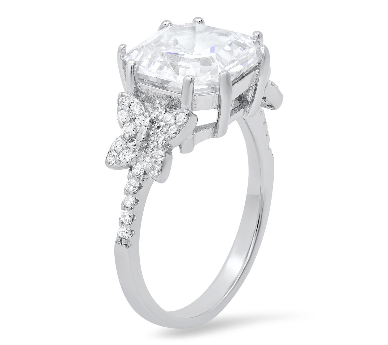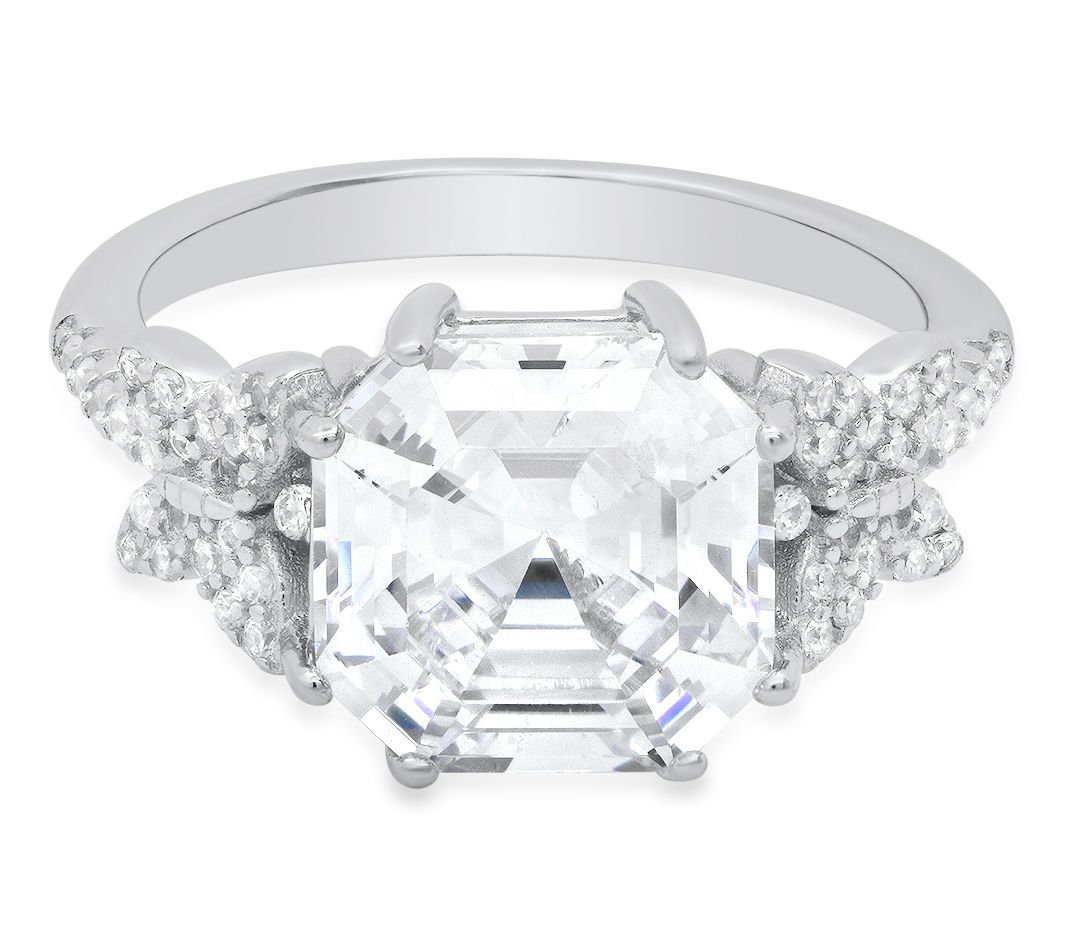 Delicate and enchanting, the asscher-cut butterfly ring is a mesmerizing masterpiece that merges elegance with nature. The sterling silver design showcases a butterfly motif adorned with an asscher-cut cubic zirconia Diamonique simulated diamond at its center, complemented by precision-cut accent stones.