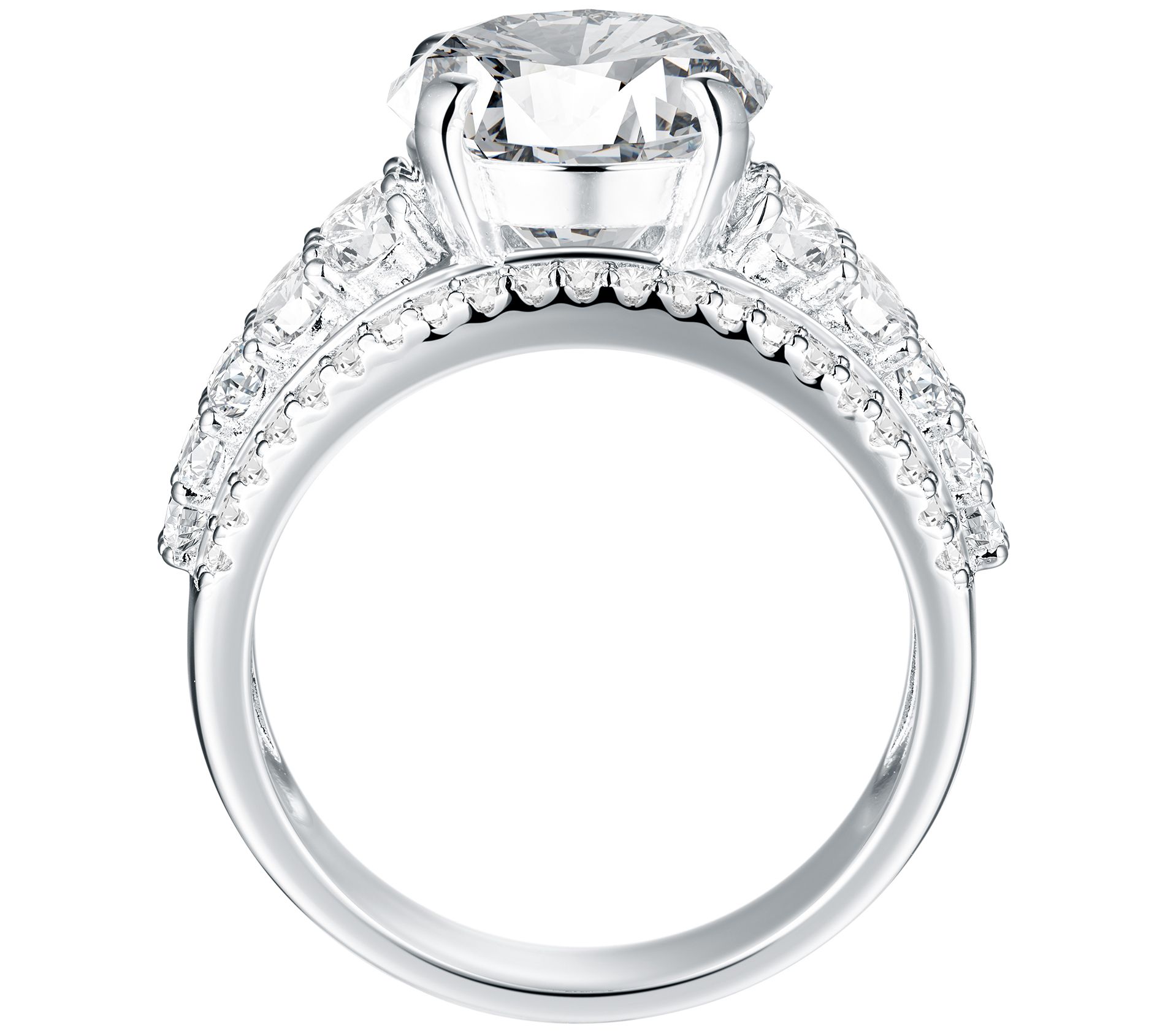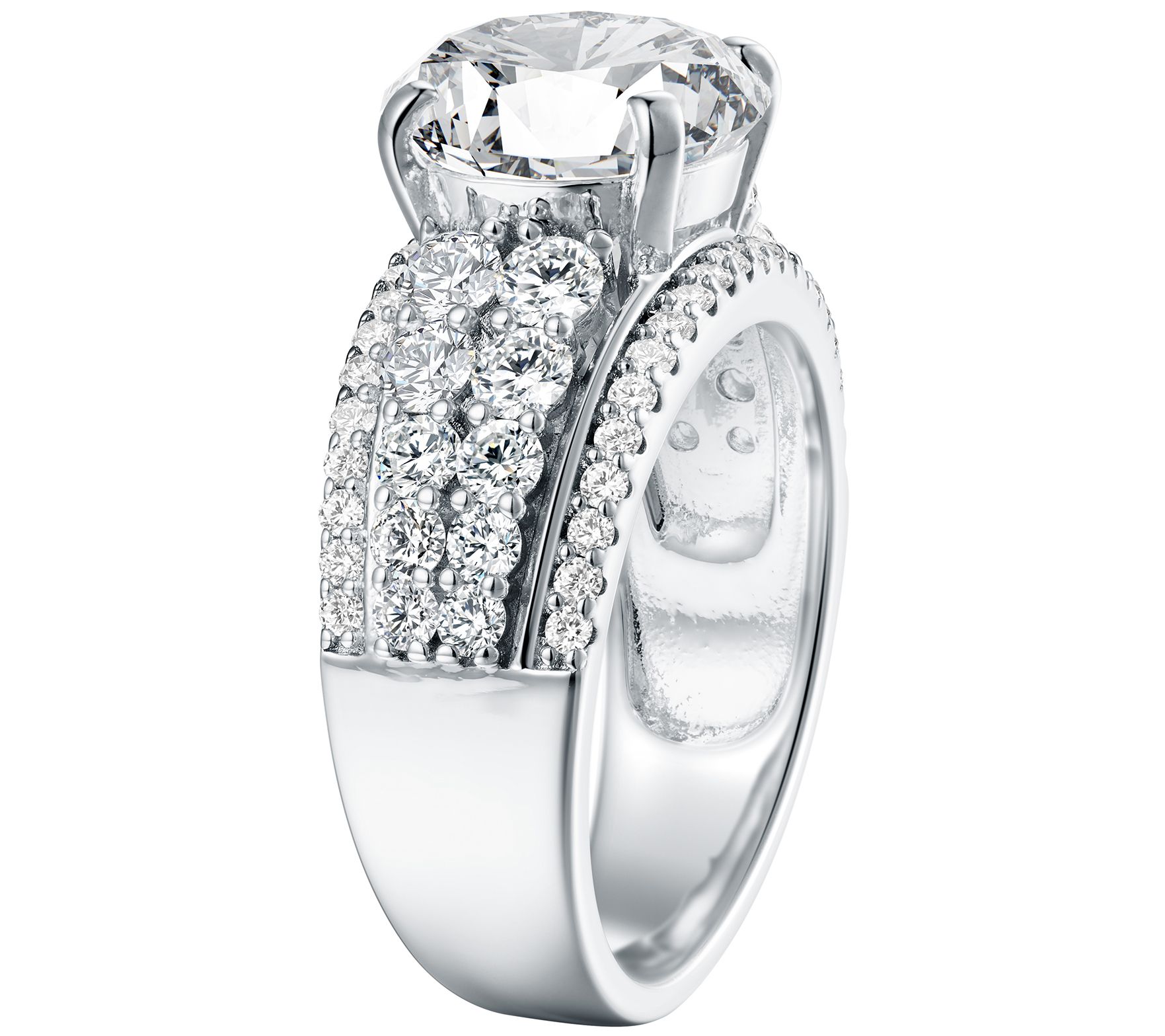 • Round-cut, prong-set Diamonique simulated diamond center; shank outlined in round-cut, prong-set Diamonique simulated diamonds