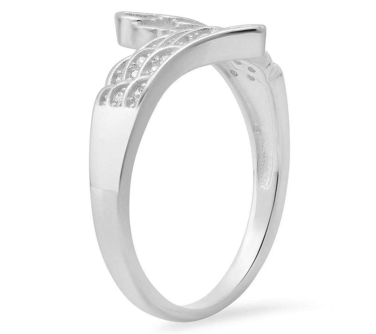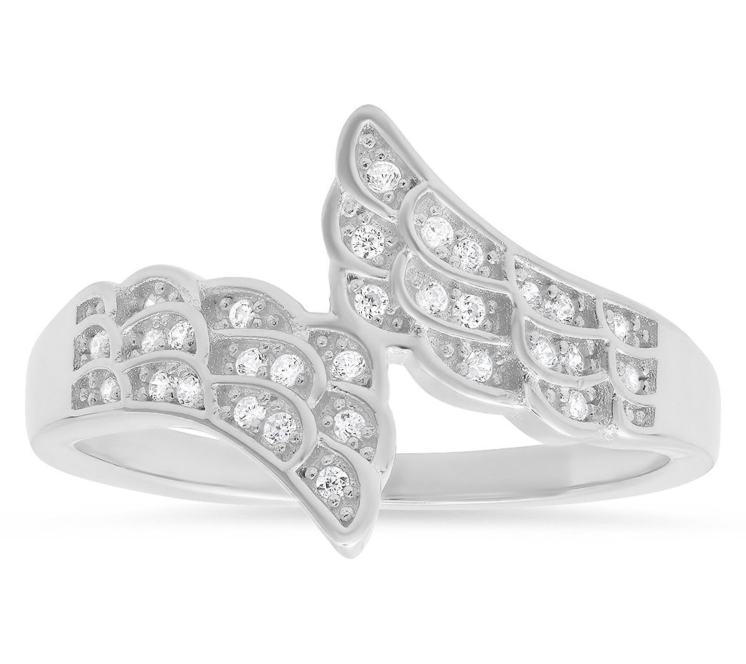 Infuse your style with a touch of celestial elegance with this angel wings ring. Crafted in sterling silver, the delicate design draws inspiration from the ethereal beauty of angel wings, evoking a sense of grace and spirituality. Each wing sparkles with Diamonique simulated diamonds, lending a subtle yet captivating shimmer. Whether for a special occasion or everyday wear, this piece effortlessly adds a heavenly charm to your jewelry collection.