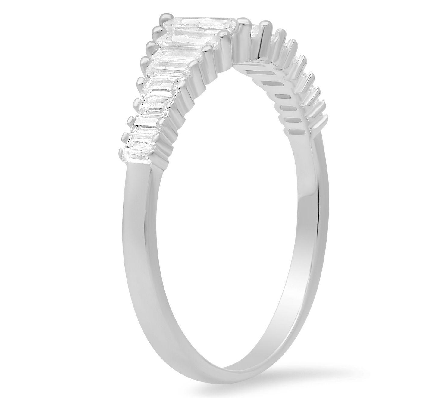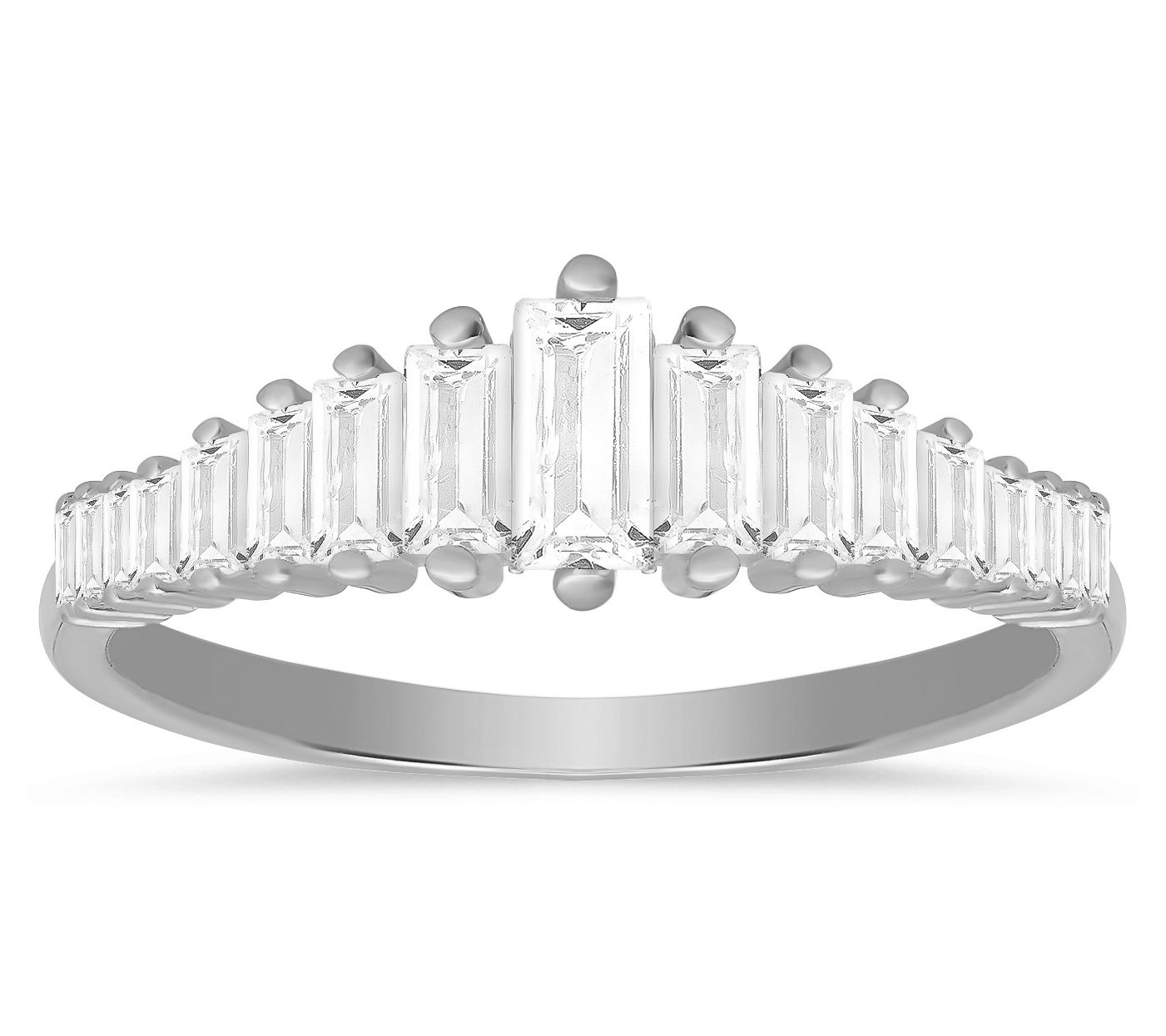 For moments when you want to make a statement, this baguette-cut ring is your go-to accessory. This piece boasts sterling silver craftsmanship, complemented by baguette-cut Diamonique simulated diamonds in a captivating geometric arrangement. The timeless elegance of the Art Deco era blends seamlessly with modern sophistication, perfect for adding a hint of sparkling glamour to any outfit.