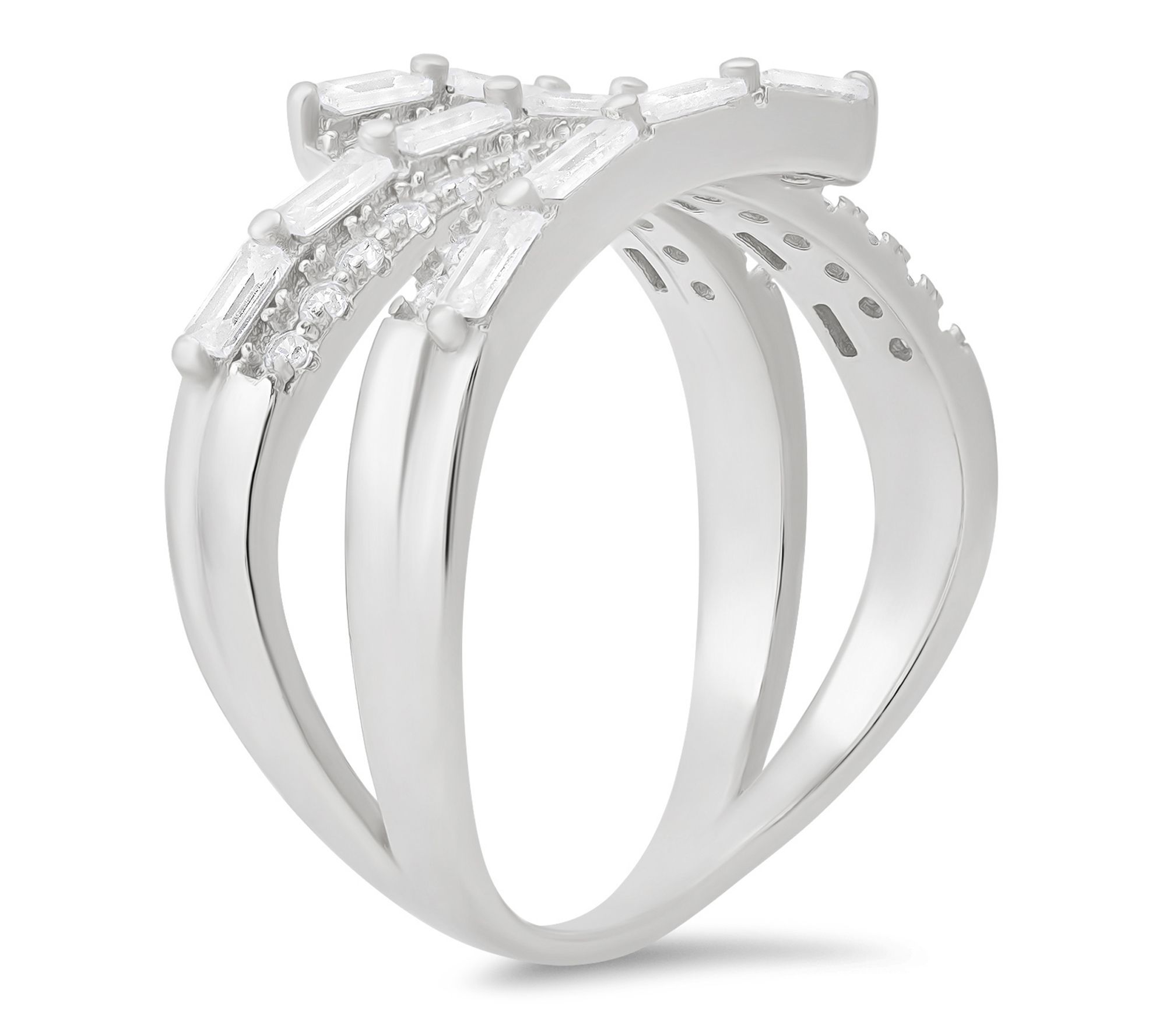 Watch how this spiral crossover ring glimmers as you move -- its elegantly sweeping baguette-cut Diamonique simulated diamonds are prong-set to radiate light from every angle. Whether you're dressing for a night out or brightening your everyday rotation, this striking sterling silver piece adds a sophisticated twist that feels both bold and beautifully polished.