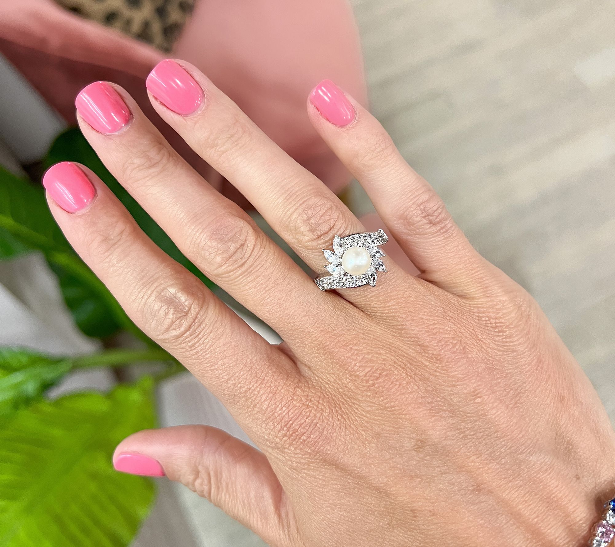 Diamonique Blooming Pearl Pave Stone Ring, Platinum or 14K Plated