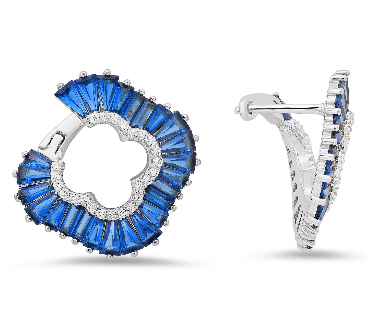 Baguette-cut, sapphire-hued and round white Diamonique simulated diamonds in clover motifs; polished hoop design; prong settings