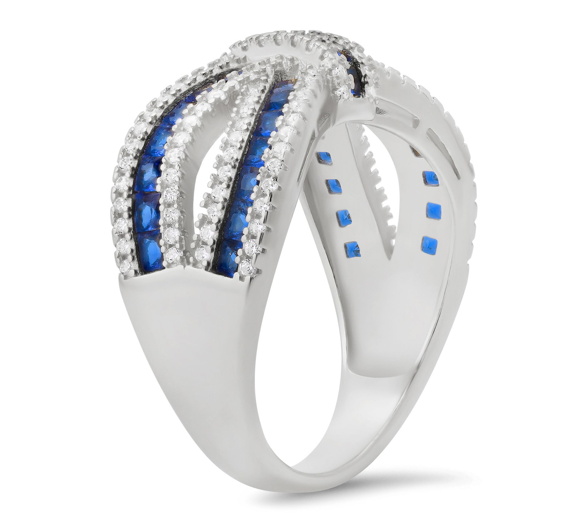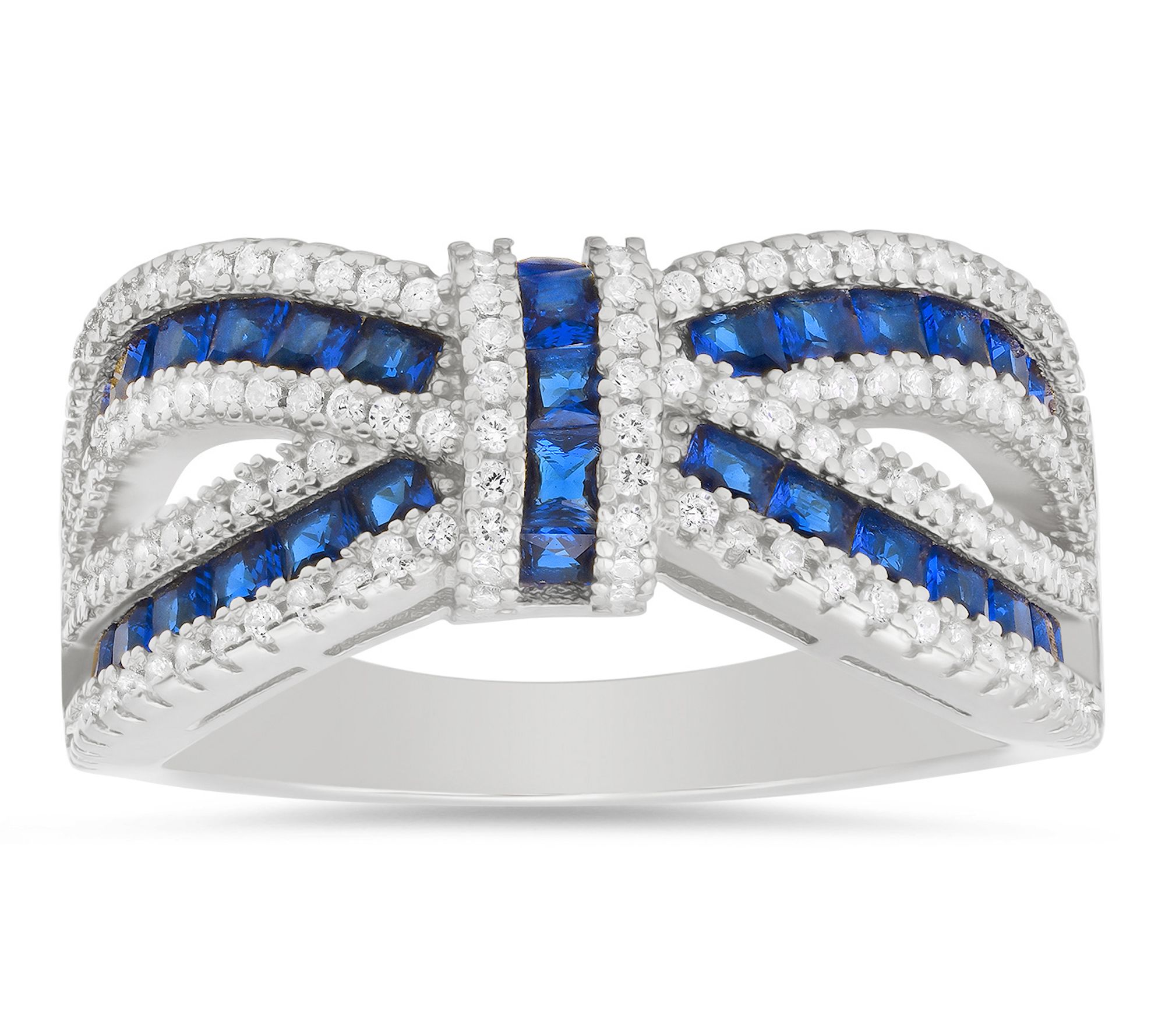 Princess-cut blue Diamonique simulated diamonds; prong settings; multi-row cluster design in a love knot motif
