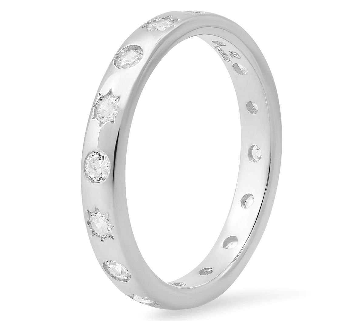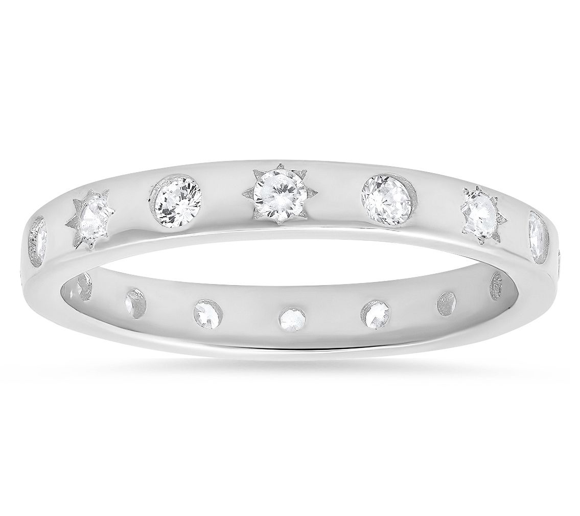 Celestial beauty meets timeless elegance with this sterling silver eternity band. Glittering Diamonique simulated diamonds set in star motifs encircle the band, reflecting light and capturing the magic of the night sky. This exquisite ring, with its blend of brilliance and symbolism, is perfect for everyday wear or special occasions.