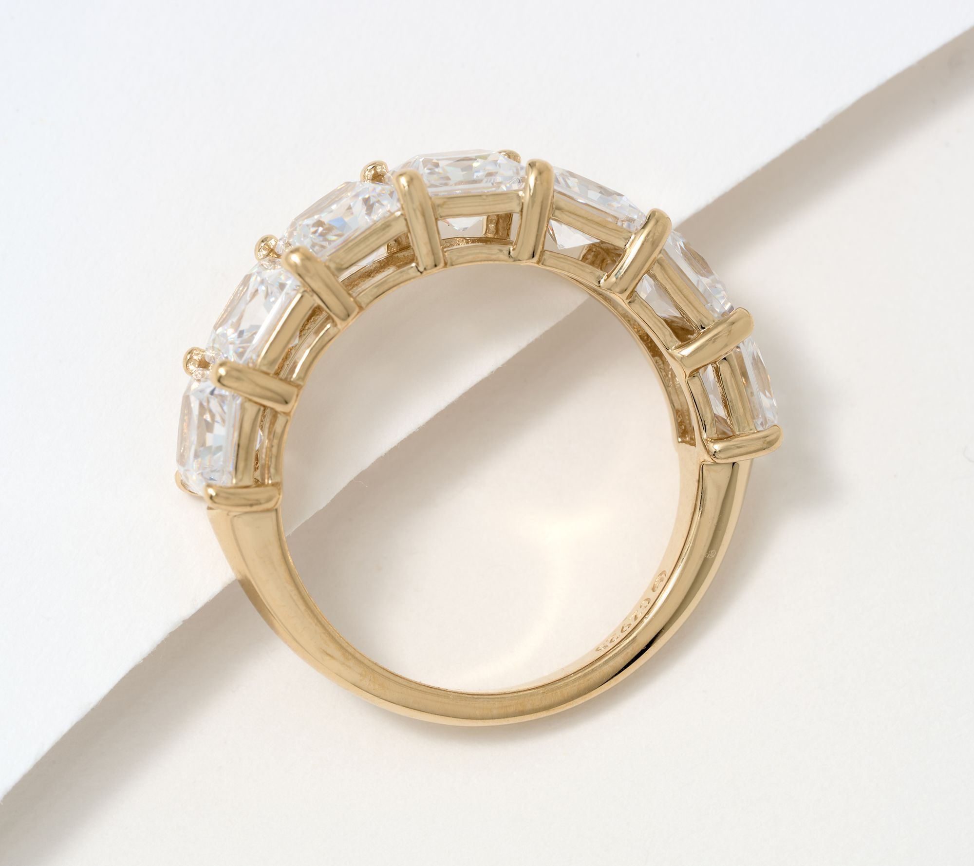 Sparkling accents bring sophistication to milestone moments, and this band ring is ready to shine. Seven Diamonique simulated diamonds in your choice of cut are showcased in 14K yellow gold-plated sterling silver, creating a head-turning accessory for dress-up or dress-down days. It's the perfect ring for stacking or wearing solo.