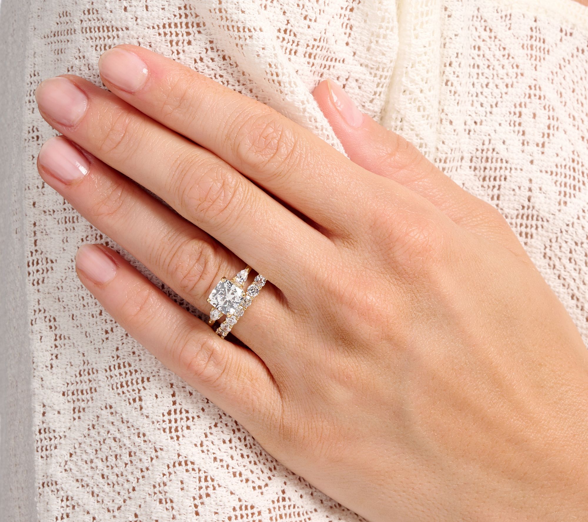 - Approximate measurements: Three-stone ring 5/16"L x 7/8"W x 1/4"H; Band ring 1/8"L x 15/16"W x 1/8"H