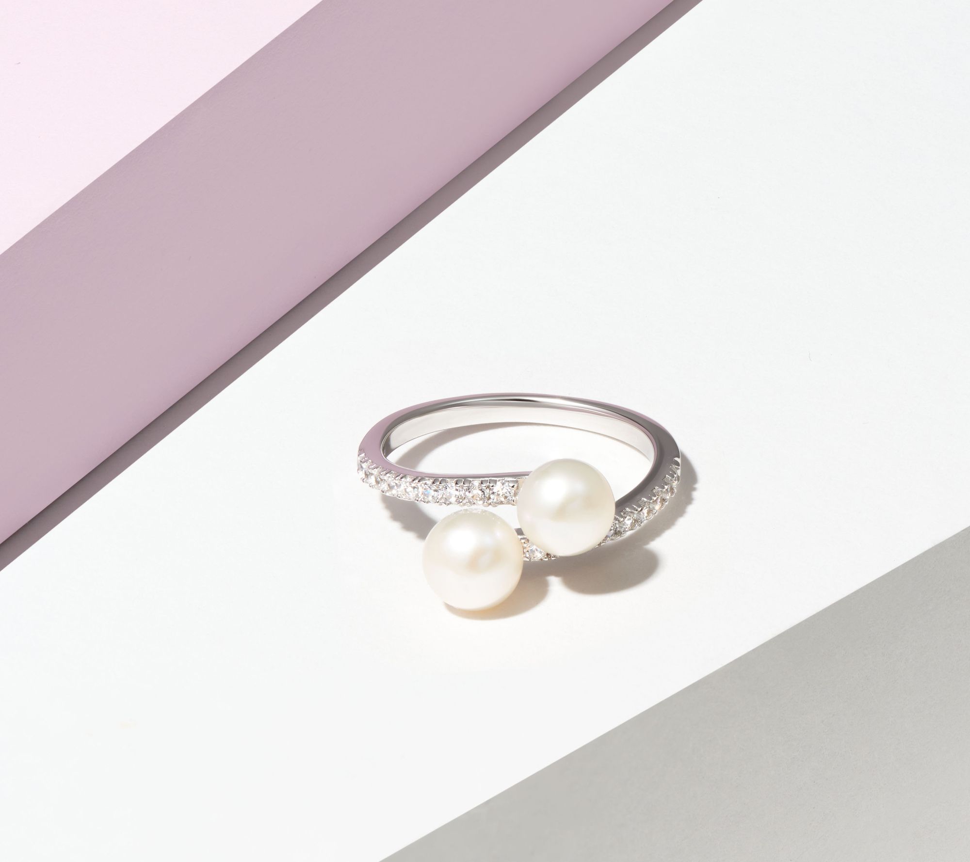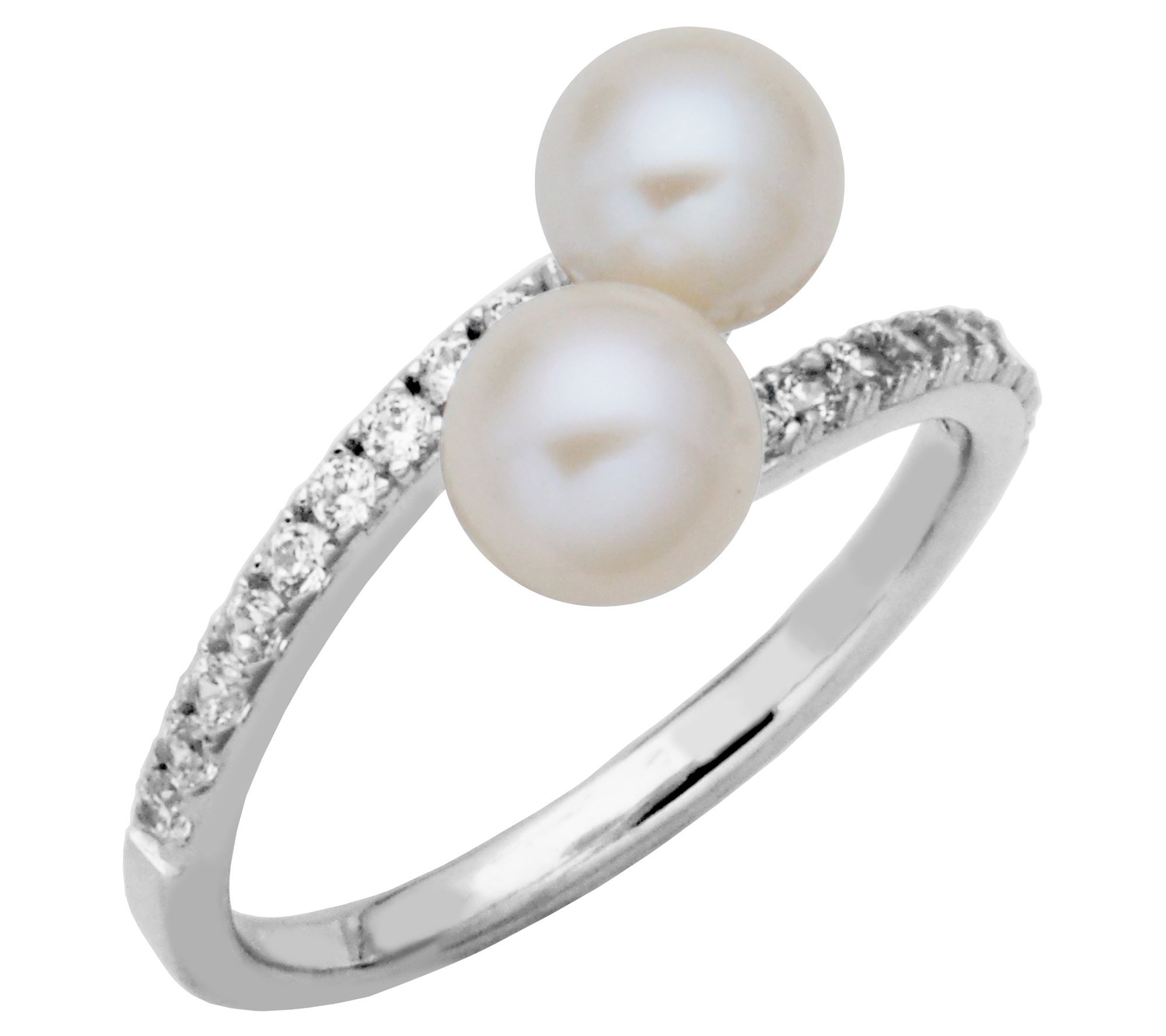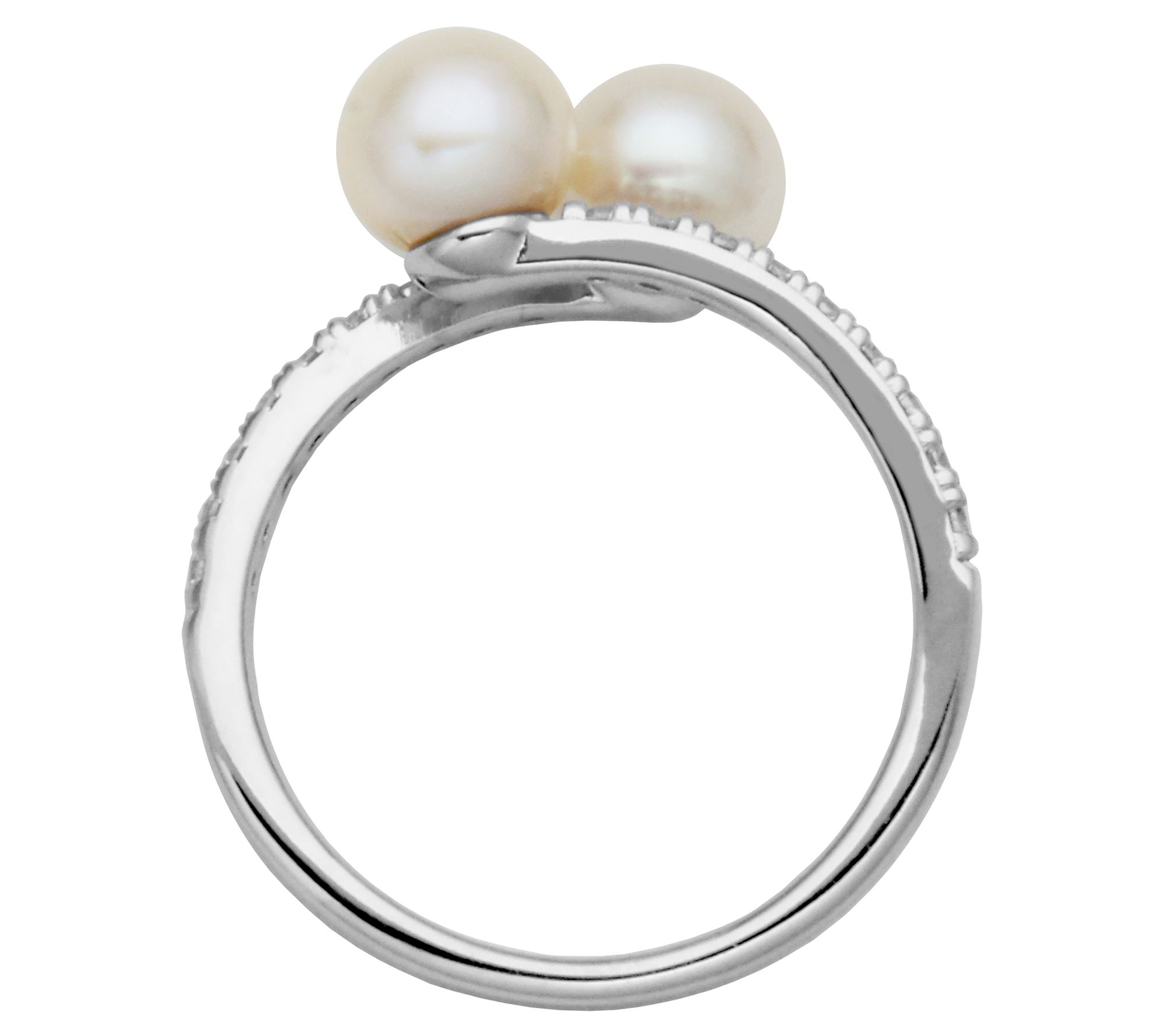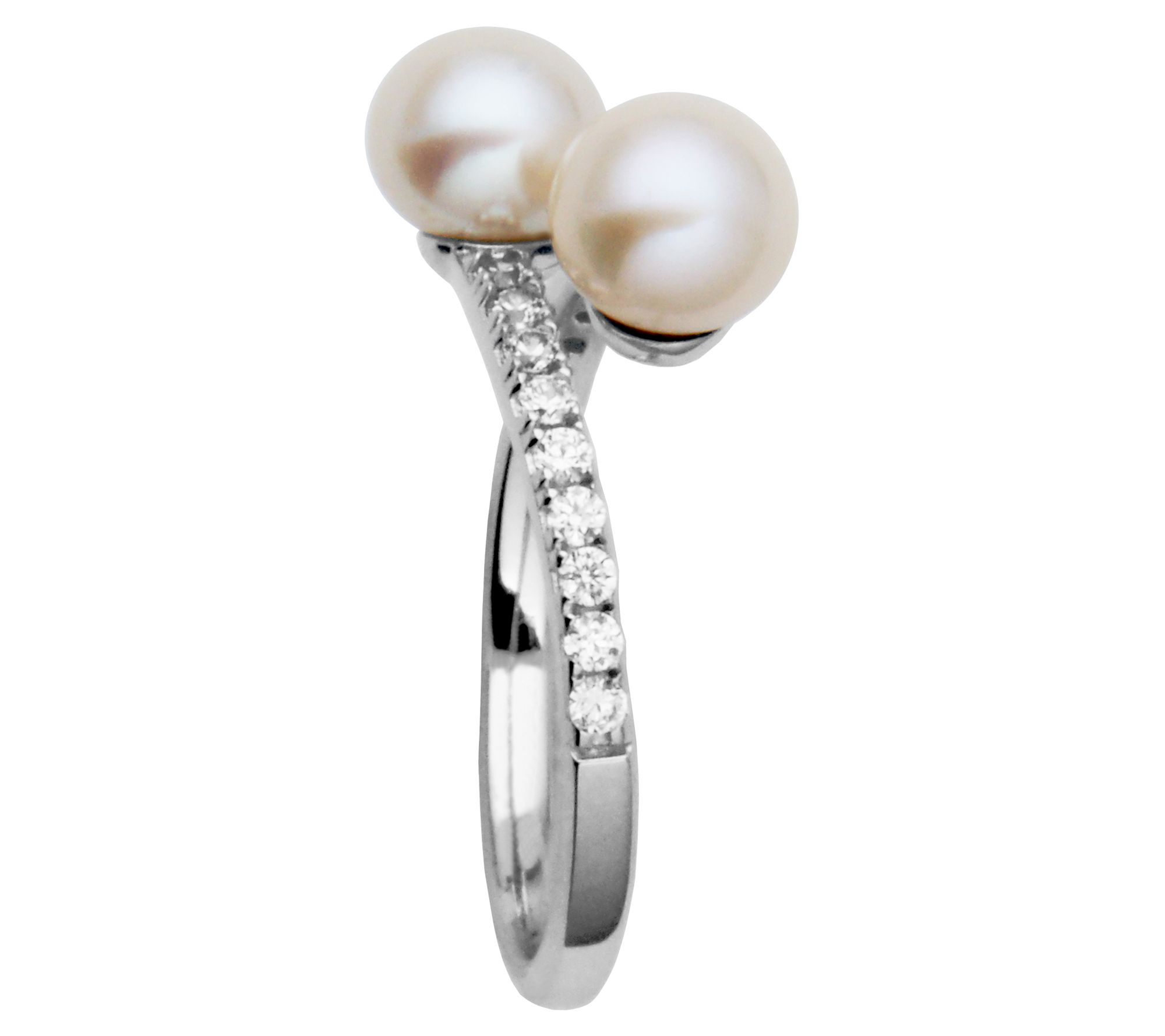 • White cultured freshwater pearls in a bypass design with round-cut, prong-set Diamonique simulated diamonds on the band