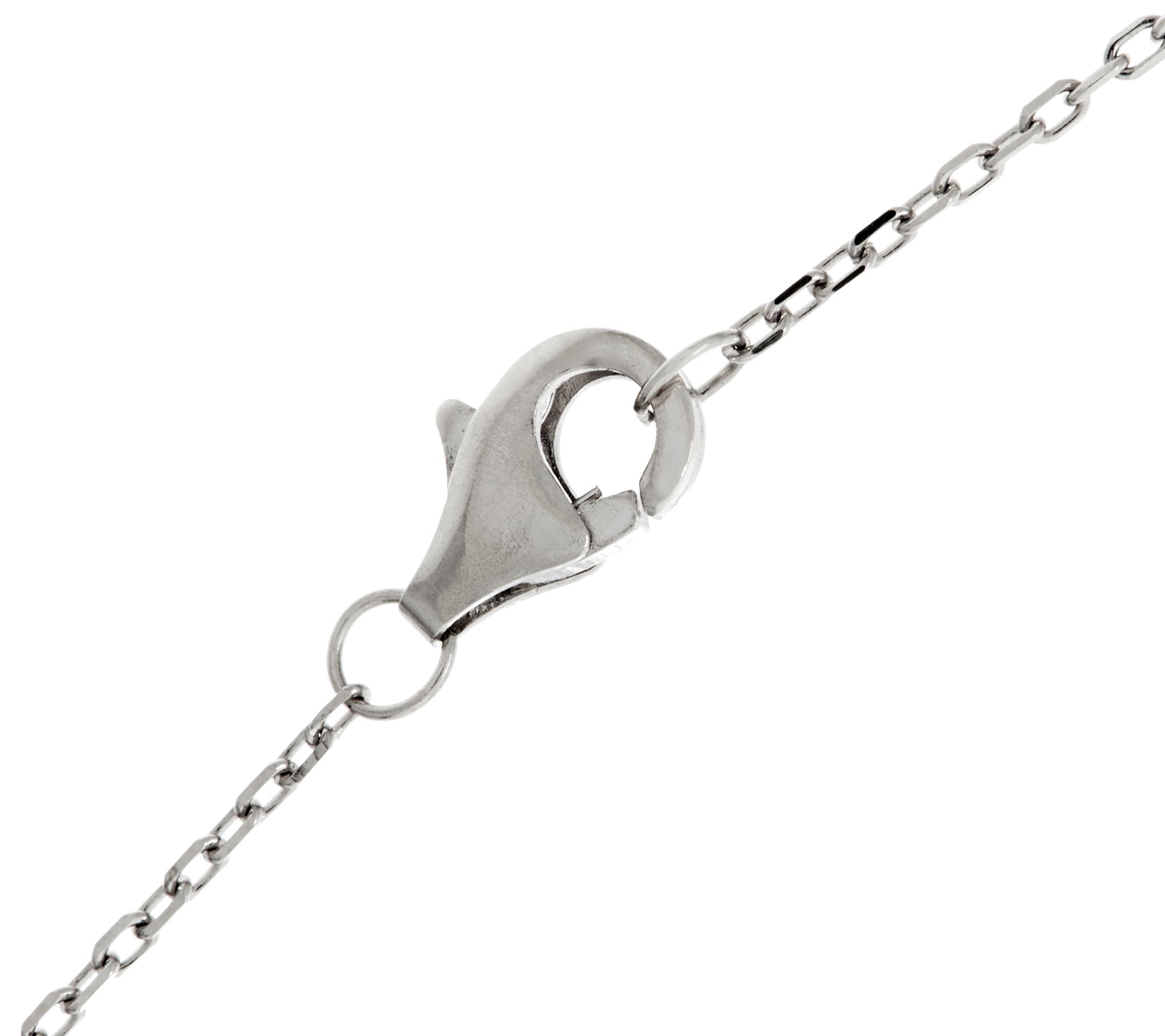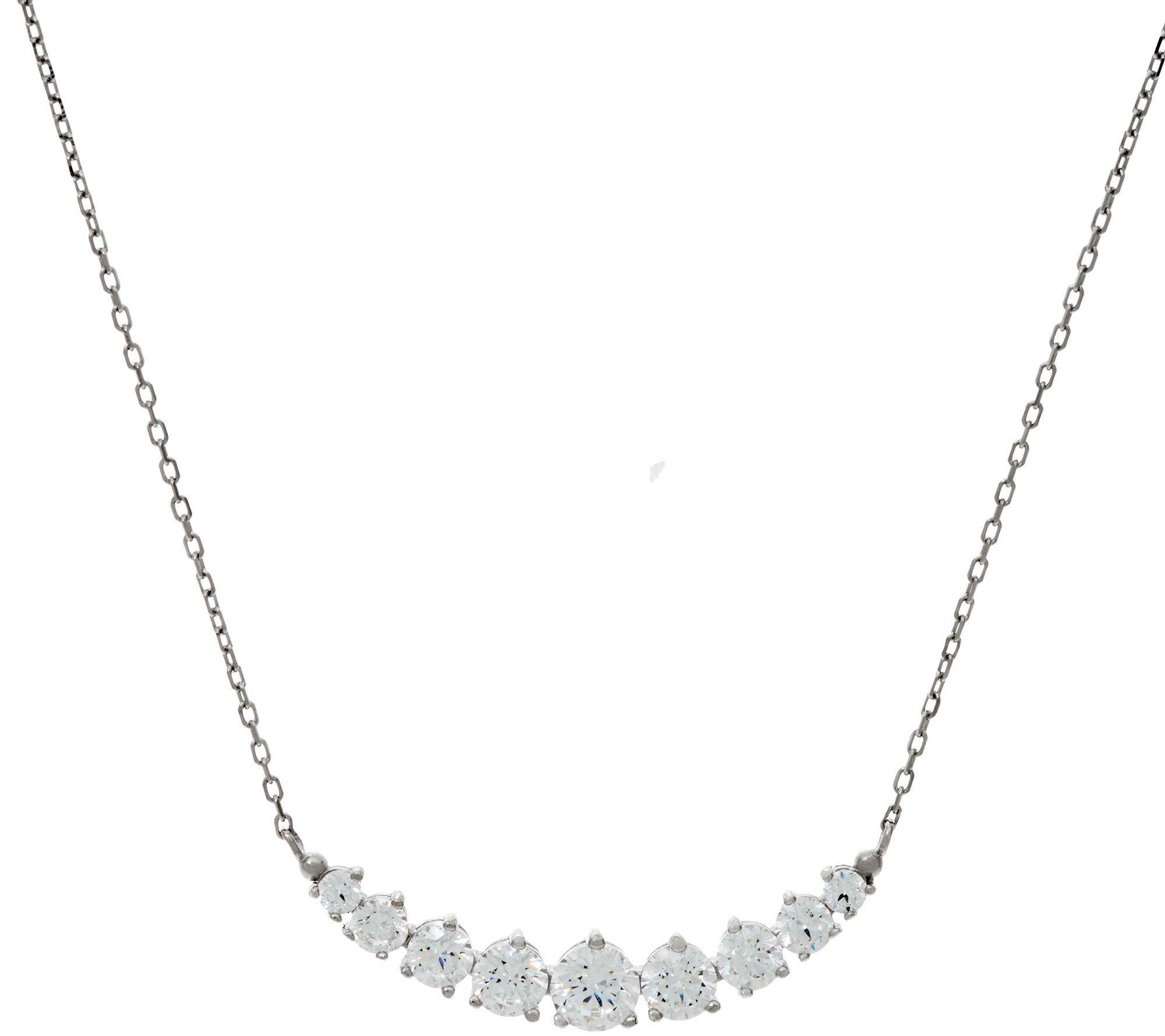 • Graduated curved bar design; prong-set, round Diamonique simulated diamonds graduate from smaller to larger at center; fine oval link chain