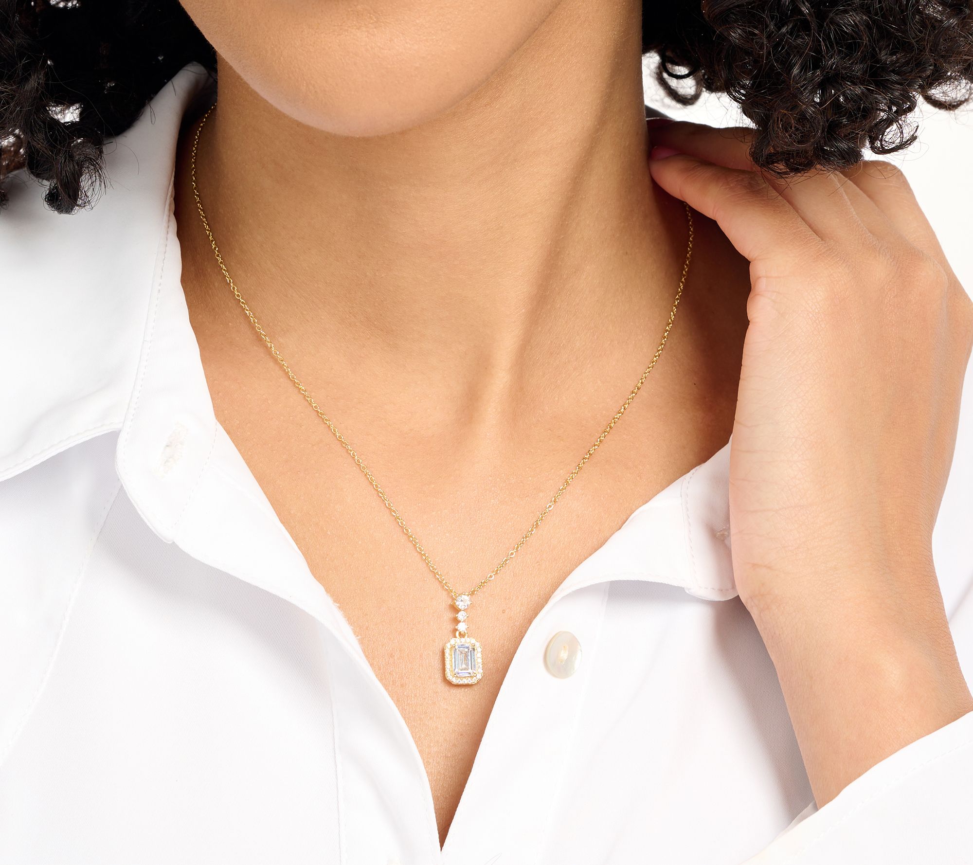 When necklace indecision strikes, reach for this sparkling emerald-cut pendant. Accented with additional round stones on the halo and bail, this standout accessory pairs well with everything from a black tie event gown to your weekend antiquing jeans-and-tee look.