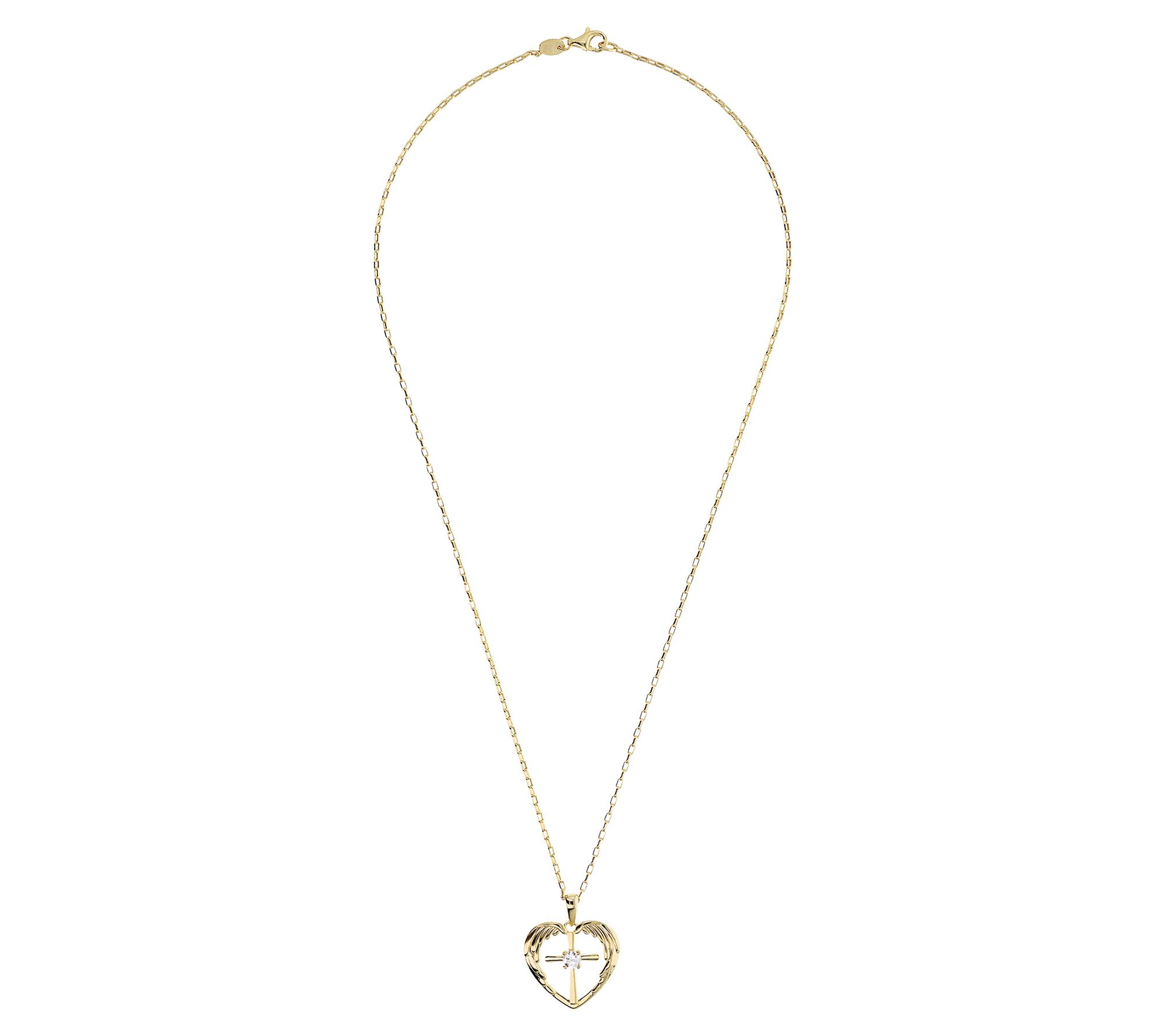 • Heart-shaped guardian angel pendant with cross and round-cut, prong-set Diamonique simulated diamond in center