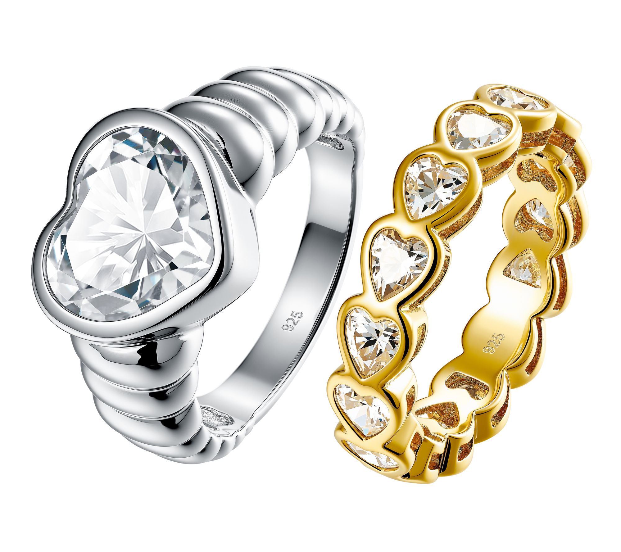 Includes rhodium-plated sterling silver engagement ring and 14K gold-plated sterling silver band ring