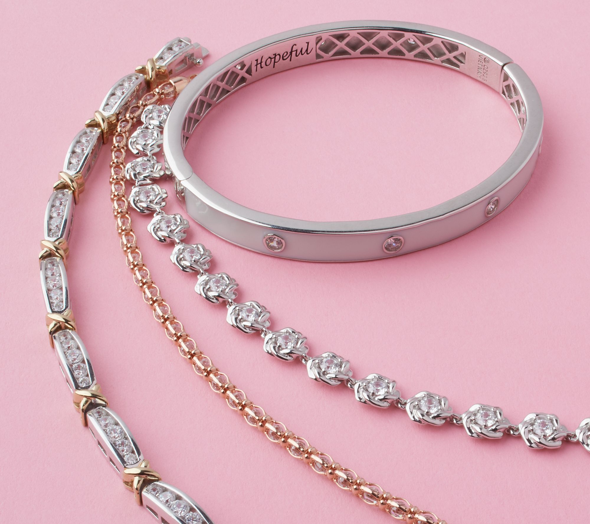 • Interlocking rings with baguette-shape Diamonique simulated diamonds; cable link chain