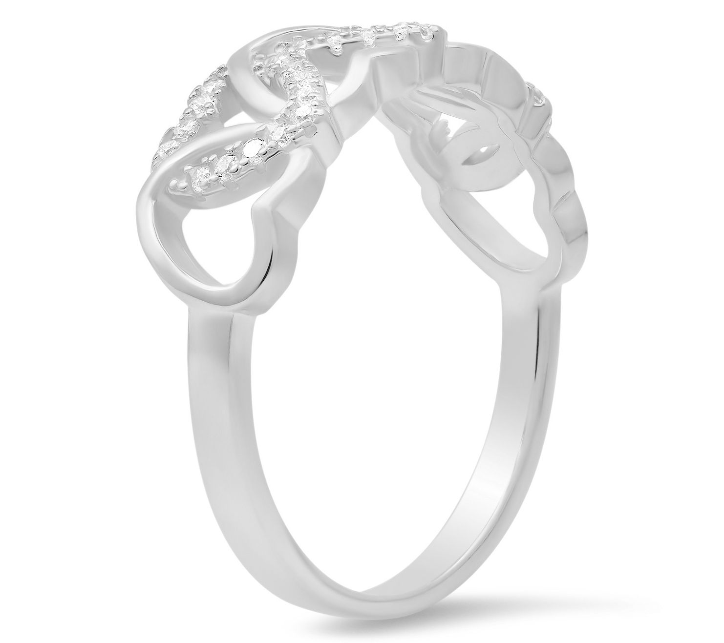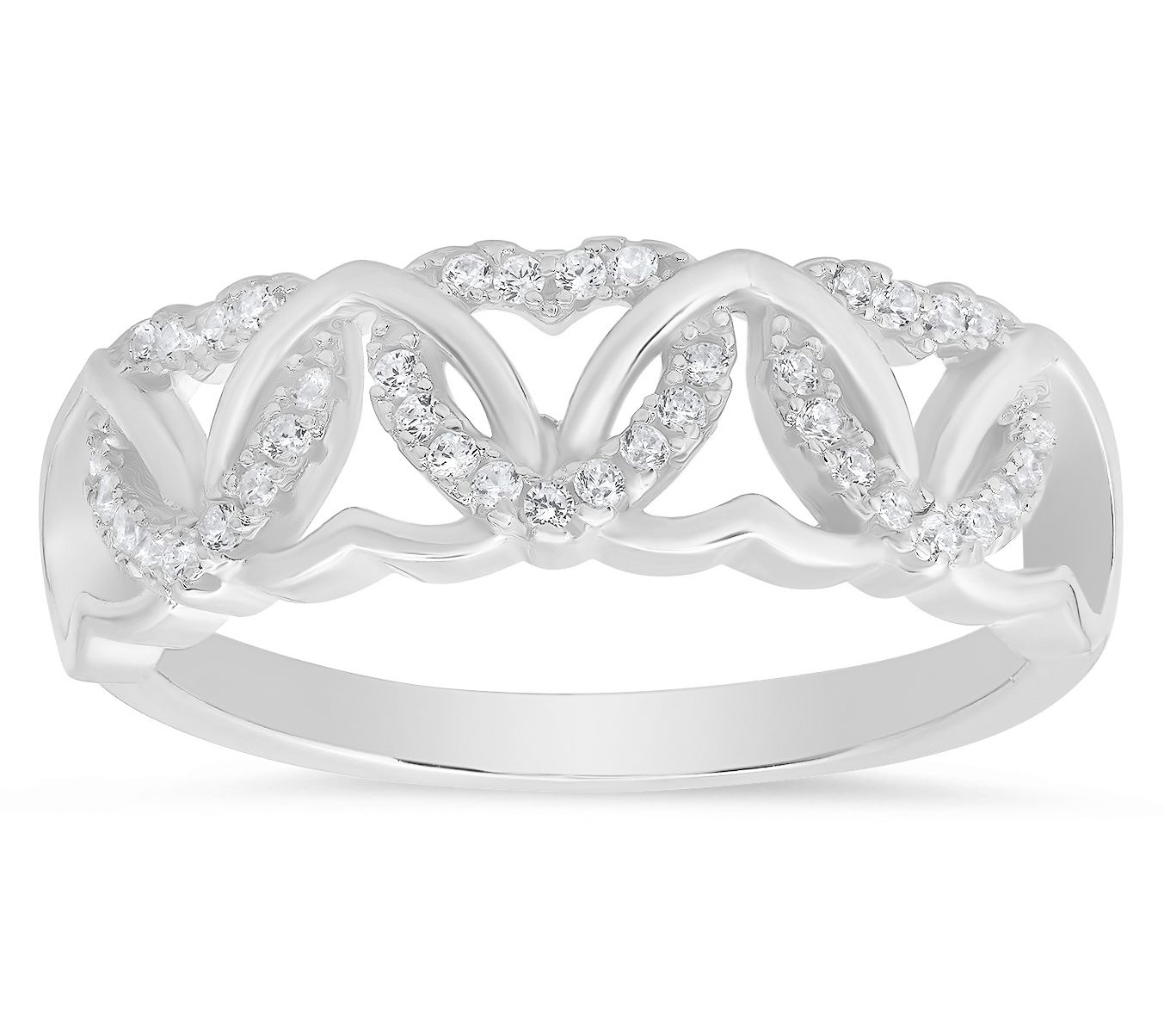 A testimony of love and unity, this sterling silver ring presents a graceful array of heart shapes that elegantly interlock. This romantic and timeless design is adorned with sparkling Diamonique simulated diamonds, capturing the essence of affection in every detail. This ring is perfect for expressing your sentiment or adding a meaningful touch to your jewelry collection.