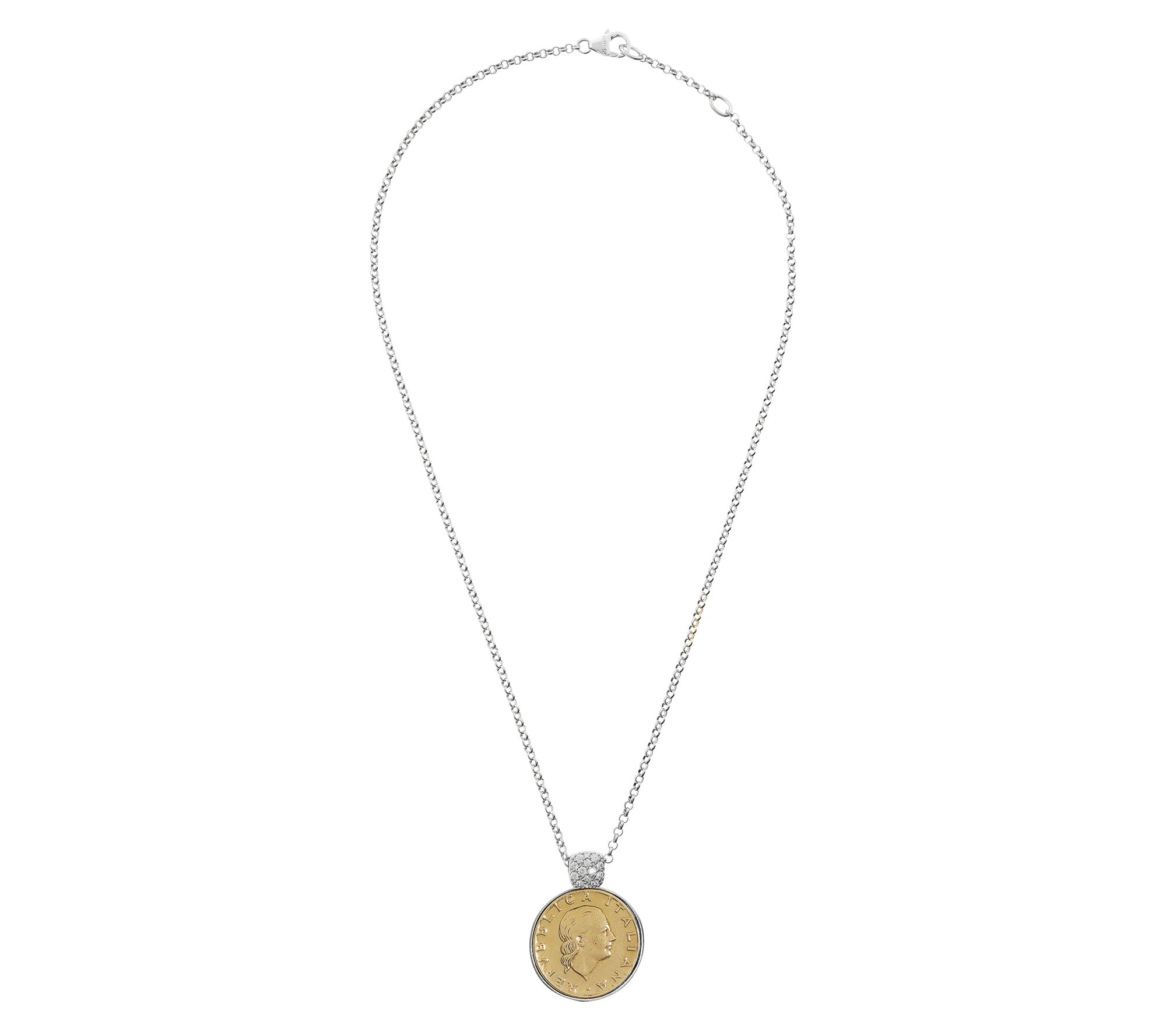 An accessory with a historied feel, this beautiful pendant showcases a 200 lire coin accented with sparkle.