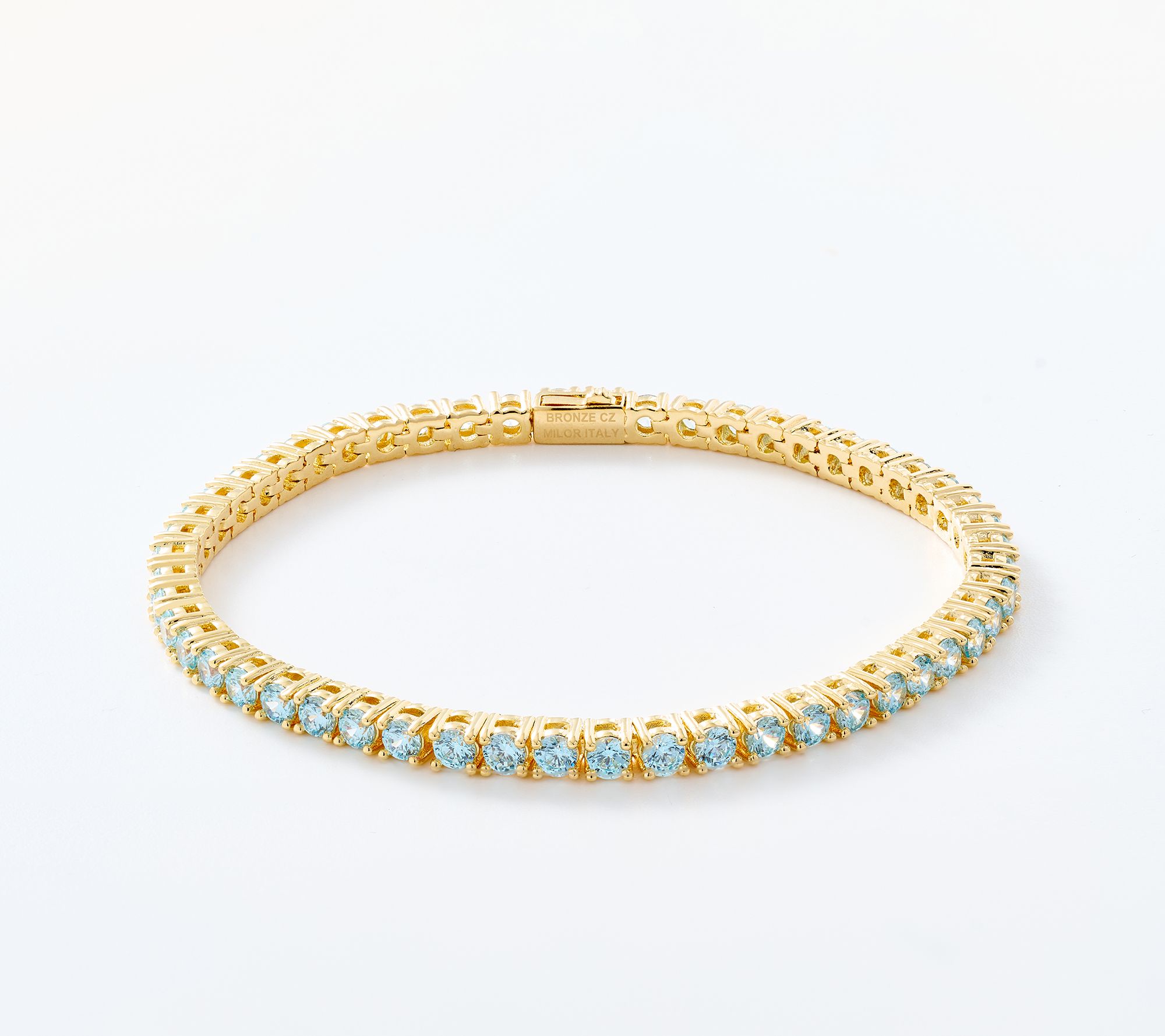 Bring a hint of Italian glamour to your everyday style with this tennis bracelet, sparkling with light blue Diamonique simulated diamonds. Whether paired with casual or dressy looks, the polished finish and delicate silhouette add a touch of color and sophistication to your wrist.