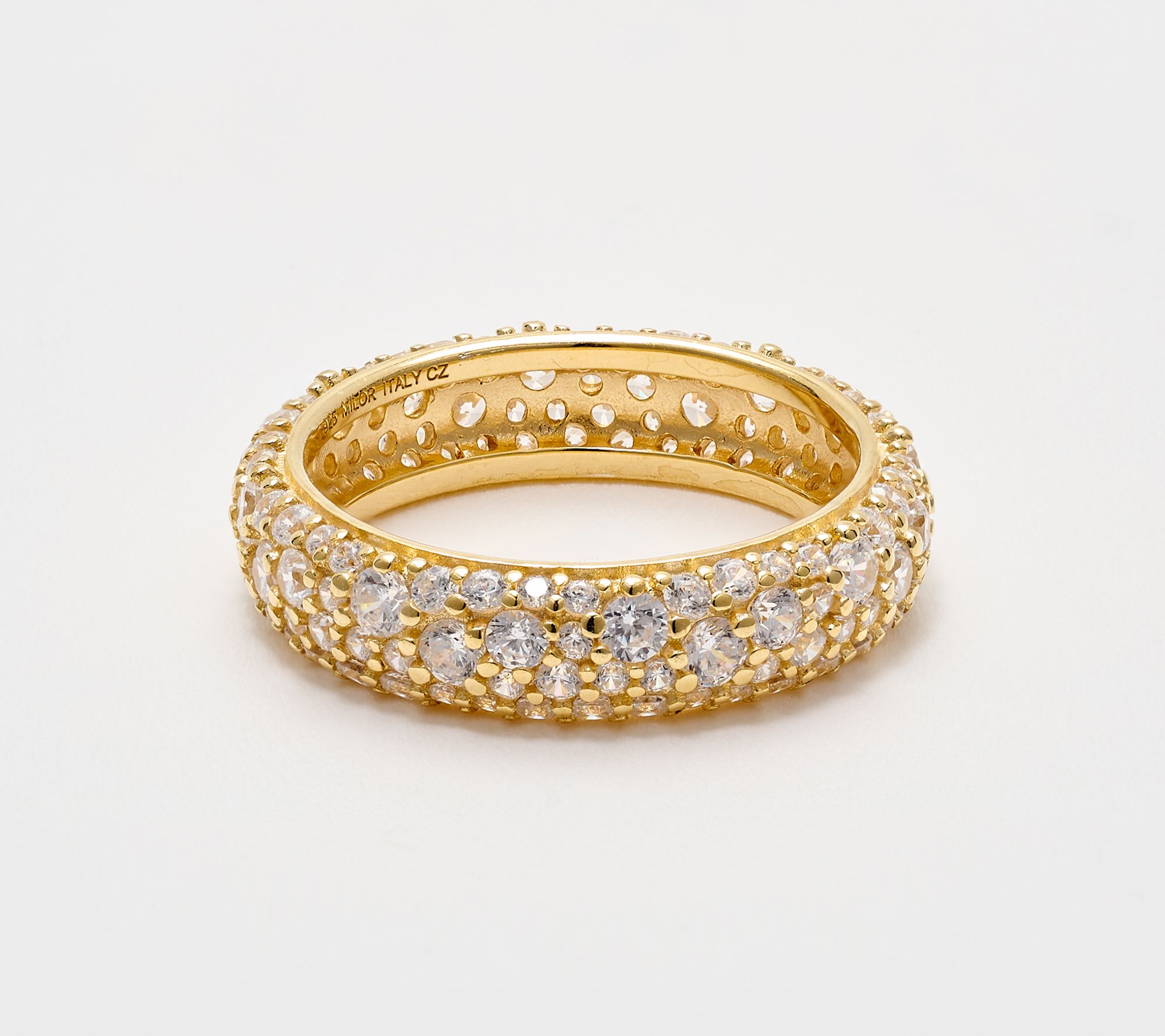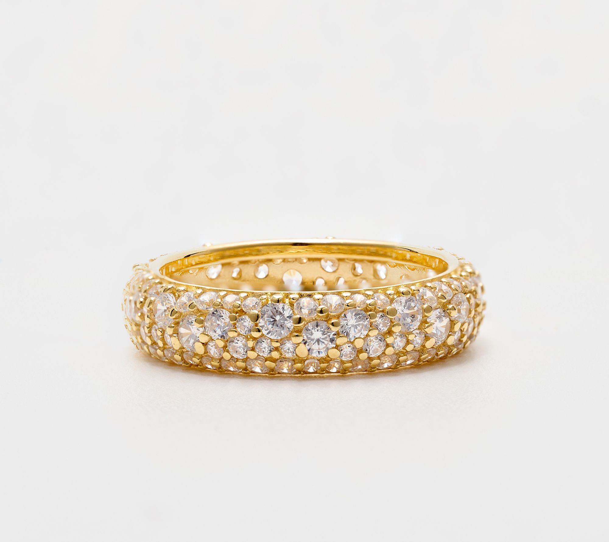 Celebrate connection and elegance every day with this eternity band ring, featuring Diamonique simulated diamonds pave-set in sterling silver for endless sparkle. Wear it alone for a subtle shimmer or stack it to add a personal touch to your ensemble -- its polished finish delivers both shine and versatility.
