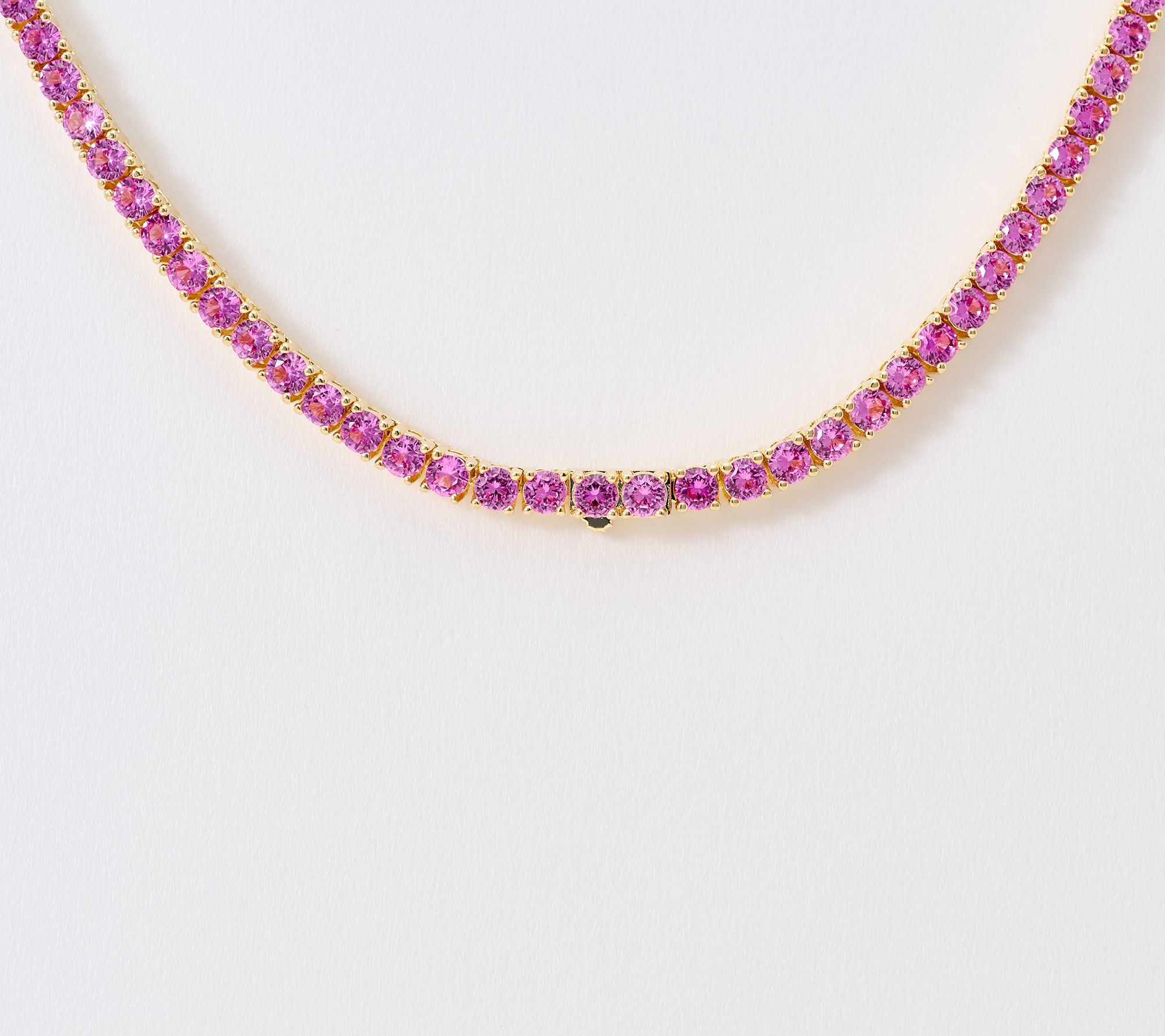 Major wow. Every eye is drawn to the sparkling elegance of this tennis necklace, where pink Diamonique simulated diamonds create a fresh, sophisticated statement -- ideal for adding color and shimmer to both daytime and evening looks.
