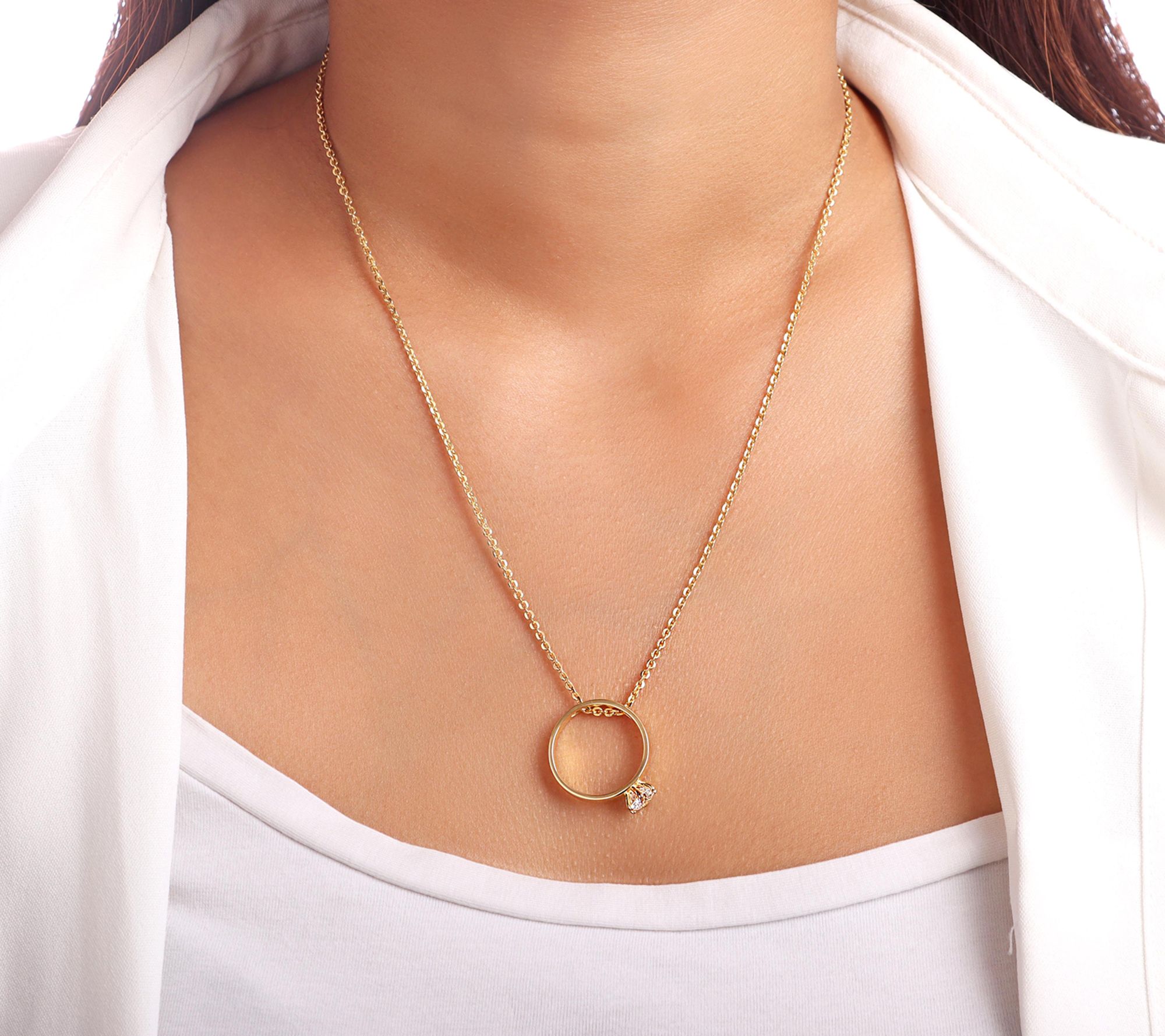Displayed on a diamond-cut rolo chain, this solitaire ring pendant pops with a sparkling cubic zirconia Diamonique simulated diamond in a prong setting.