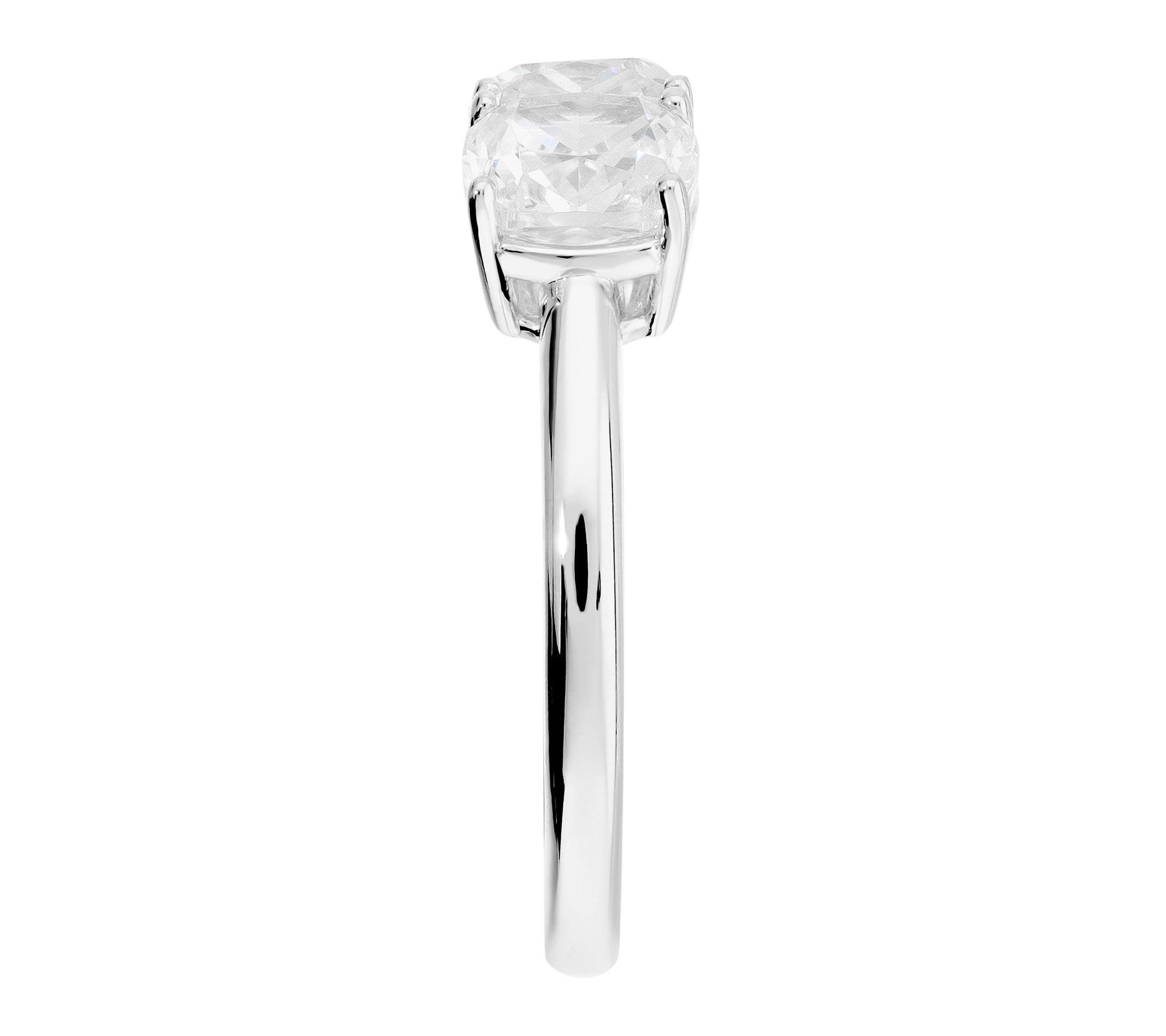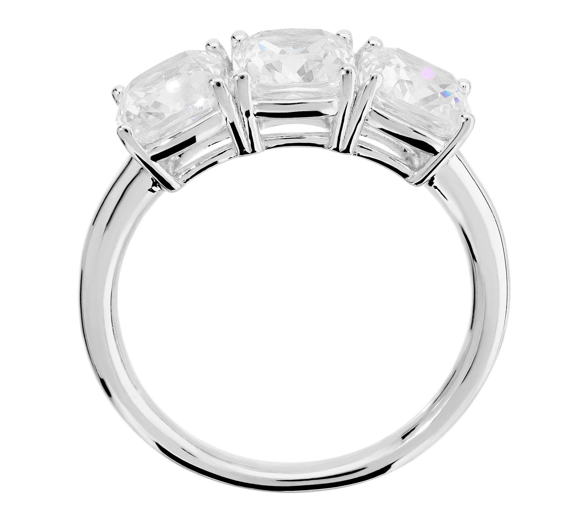 • Three cushion-cut, prong-set Diamonique simulated diamonds in a trilogy design; polished band