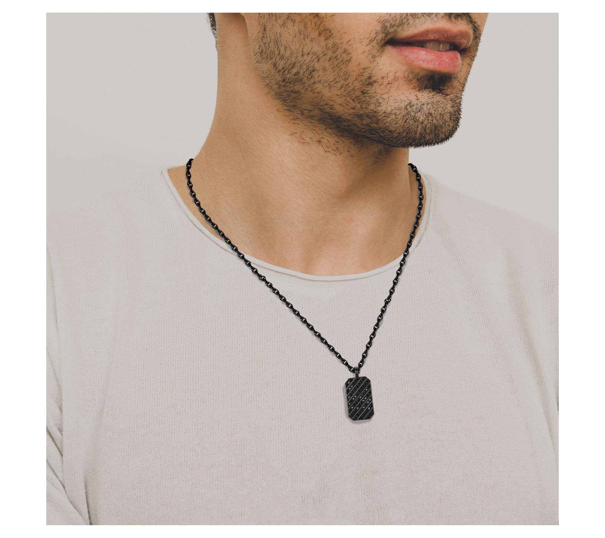 An updated classic, this men's gunmetal dog tag pendant with chain makes a striking addition to any outfit. The bold design features black Diamonique simulated diamonds in a pave setting.