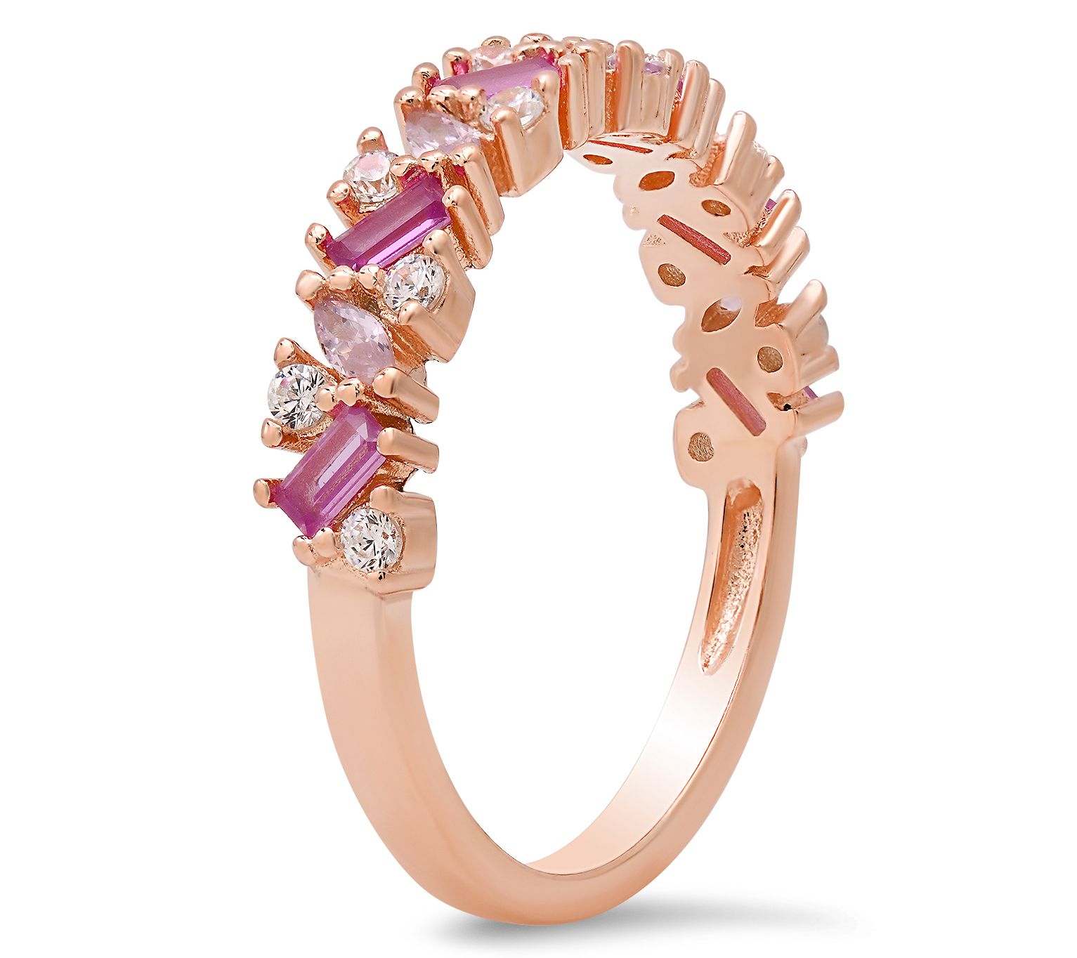 Baguette, marquise, and round-cut pink and white stones; prong settings; eternity band design