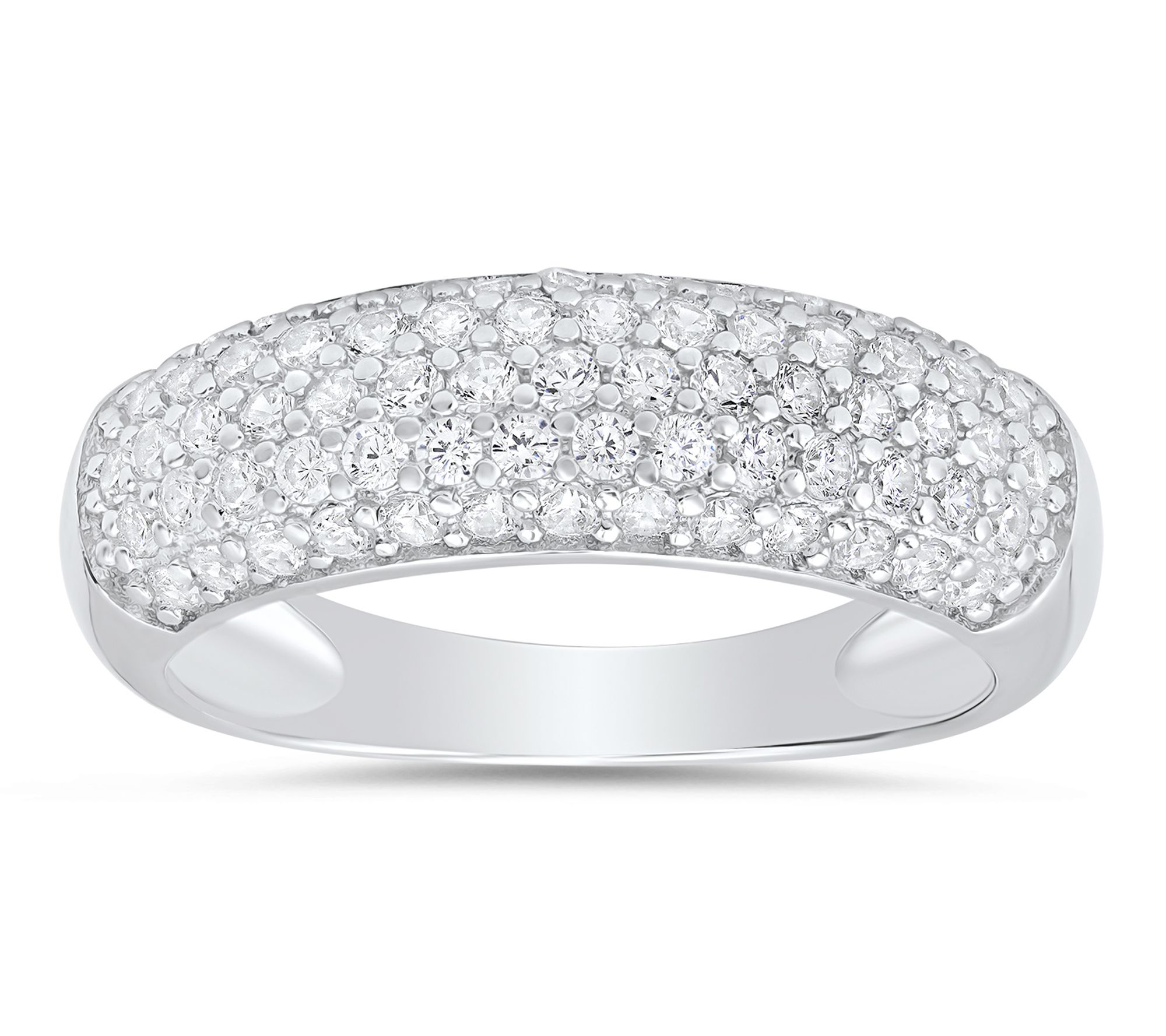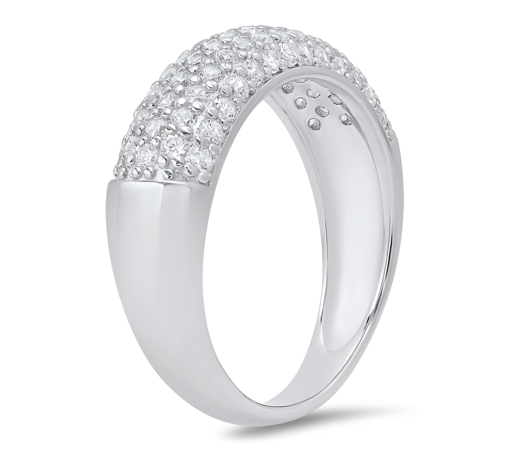 Round, prong-set Diamonique stones across multiple rows; pave band design; white metal color