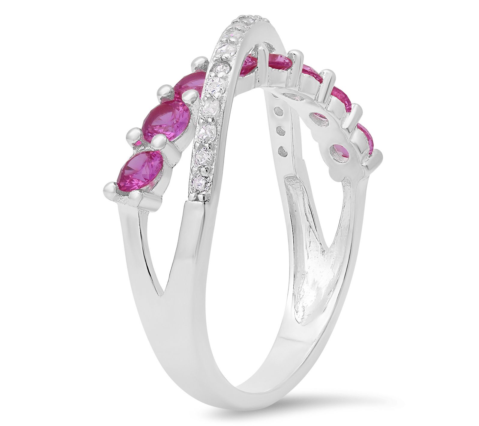 Round, prong-set pink and white simulated diamonds; polished finish; crossover, multi-row design
