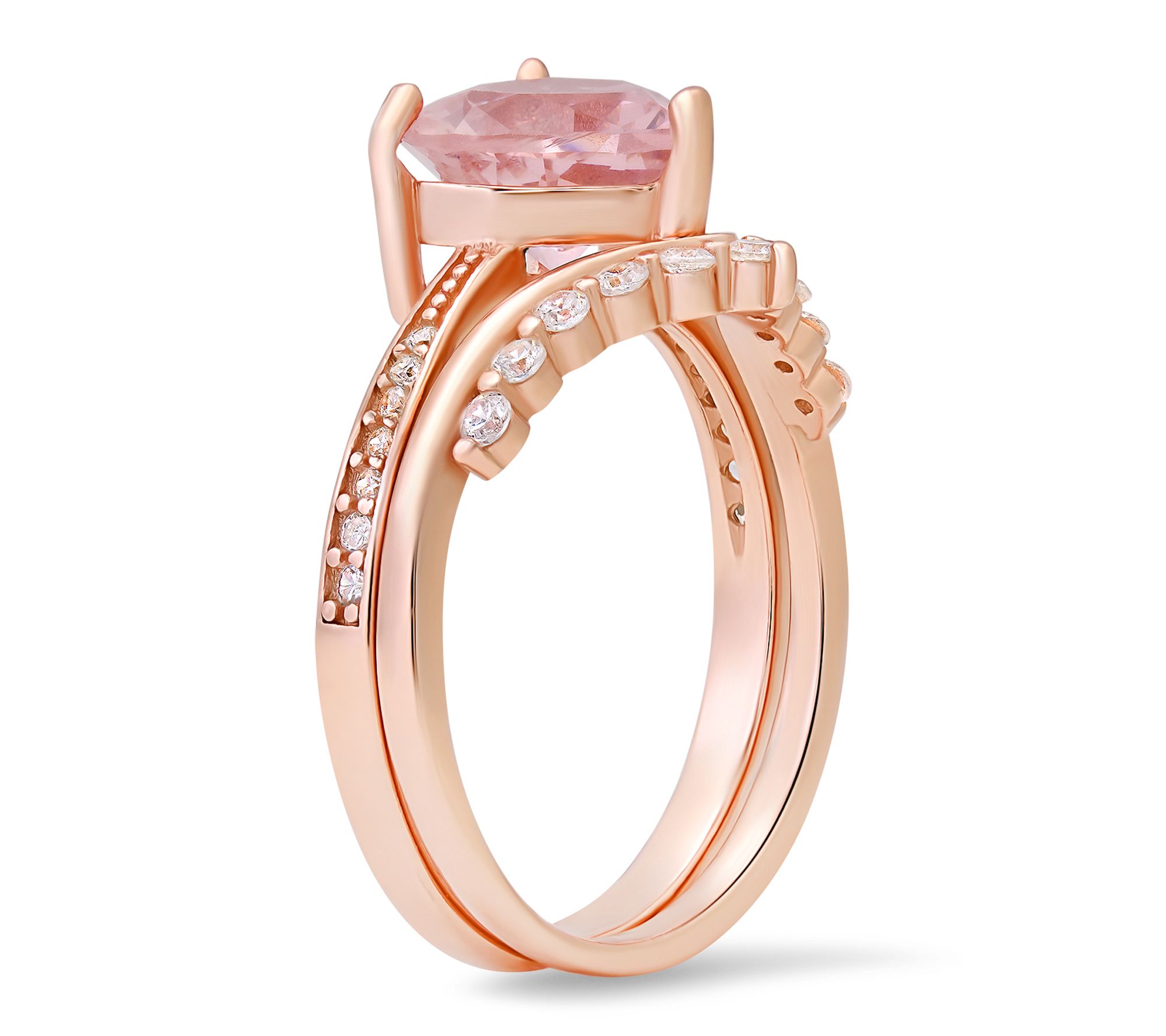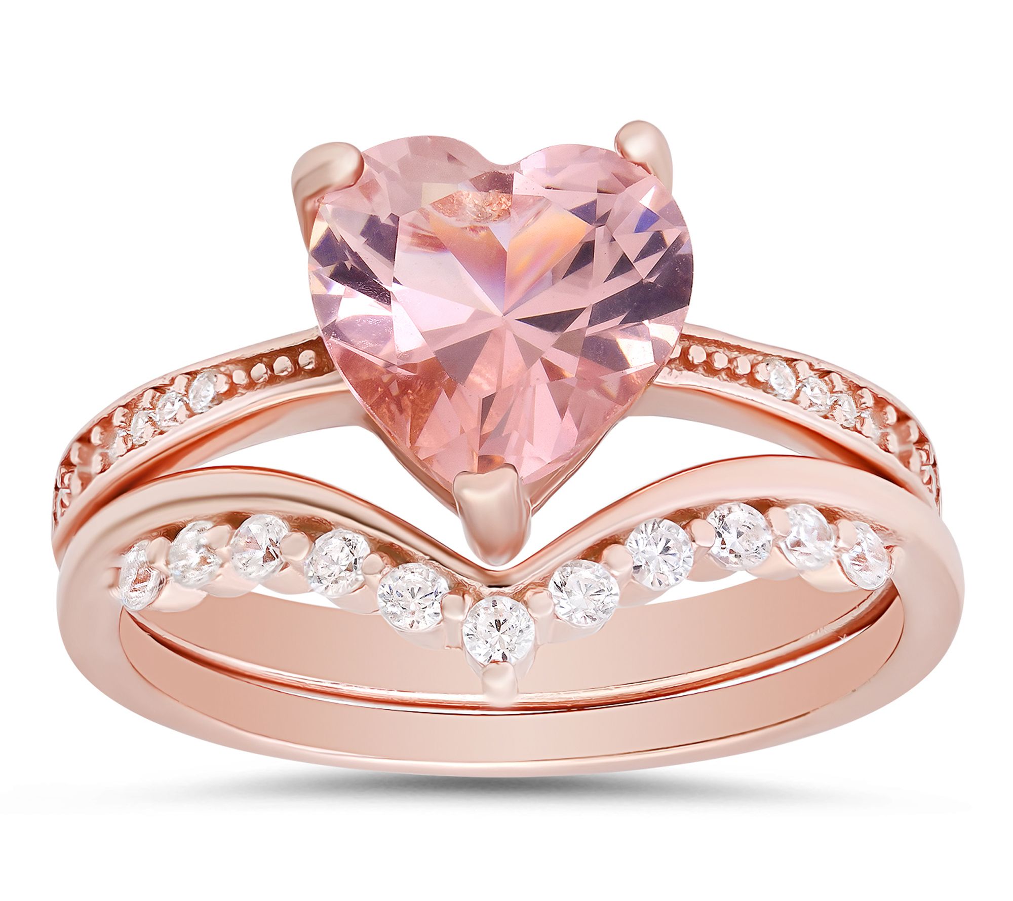 Sweep someone off their feet -- or treat yourself to a moment of romance -- with this rosetone heart stackable ring set. Featuring a captivating heart-cut center and coordinated band, each ring dazzles with Diamonique stones that shimmer against warm blush tones. Stack them together for a striking layered effect or wear separately for a delicate touch of sparkle.