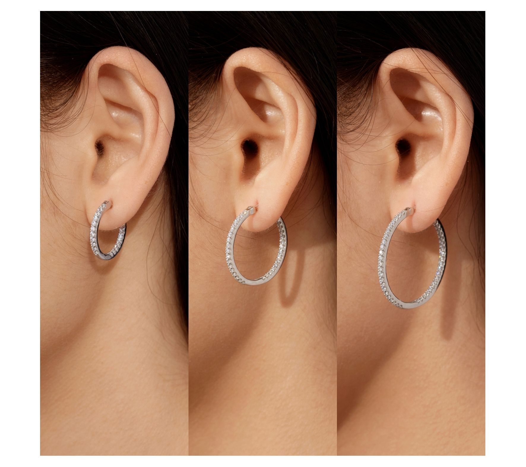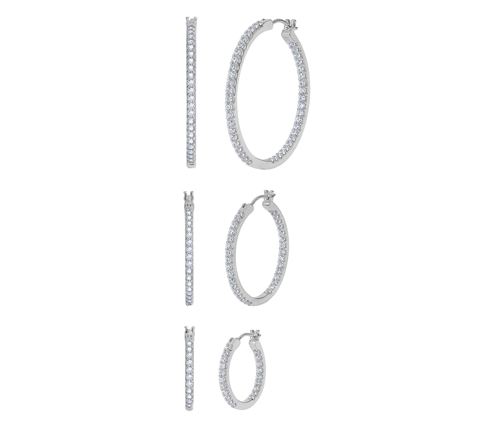 - Three pairs of hoop earrings in graduated sizes; each pair outlined with round prong-set Diamonique simulated diamonds