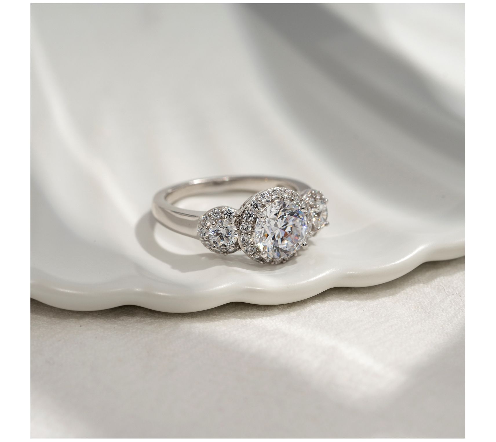 So much to see. At first, your eye will be drawn to the three round, prong-set cubic zirconia Diamonique(R) simulated diamonds shimmering and shining from this sterling silver ring. Then, you'll notice the intricate halos of round, bead-set Diamonique simulated diamonds that surrounds each, creating an elegant effect.