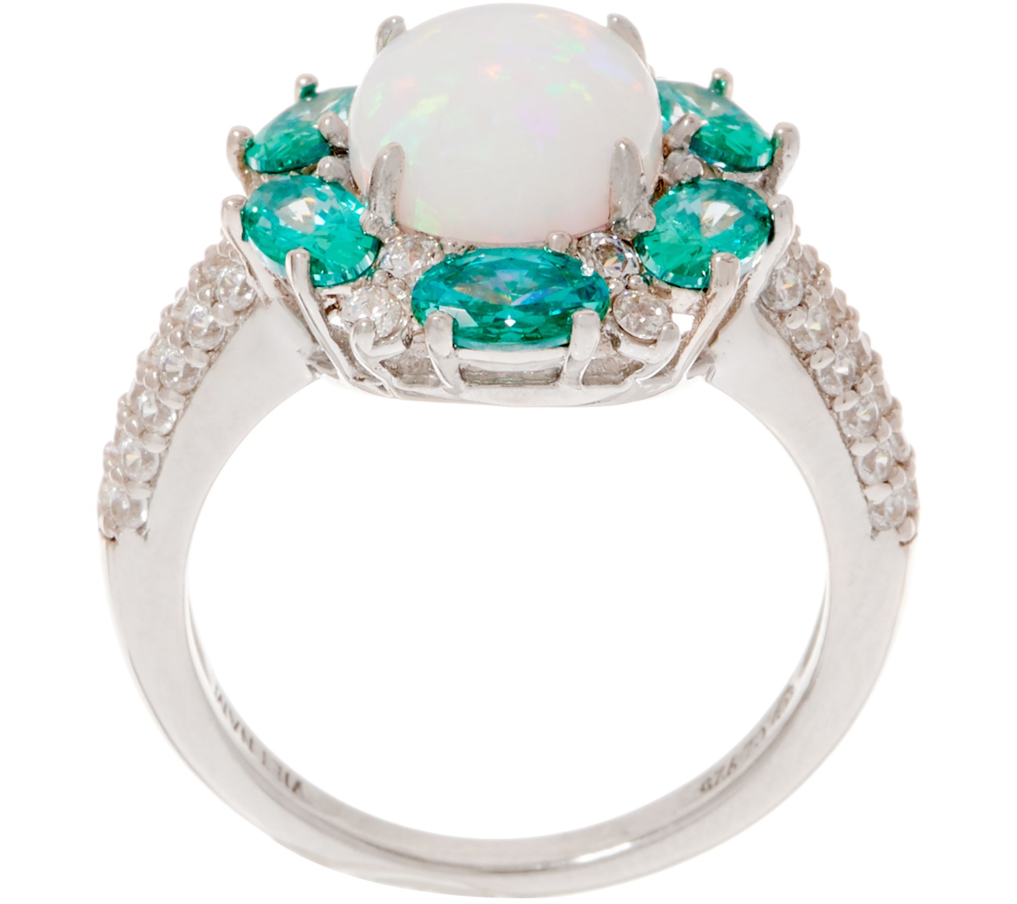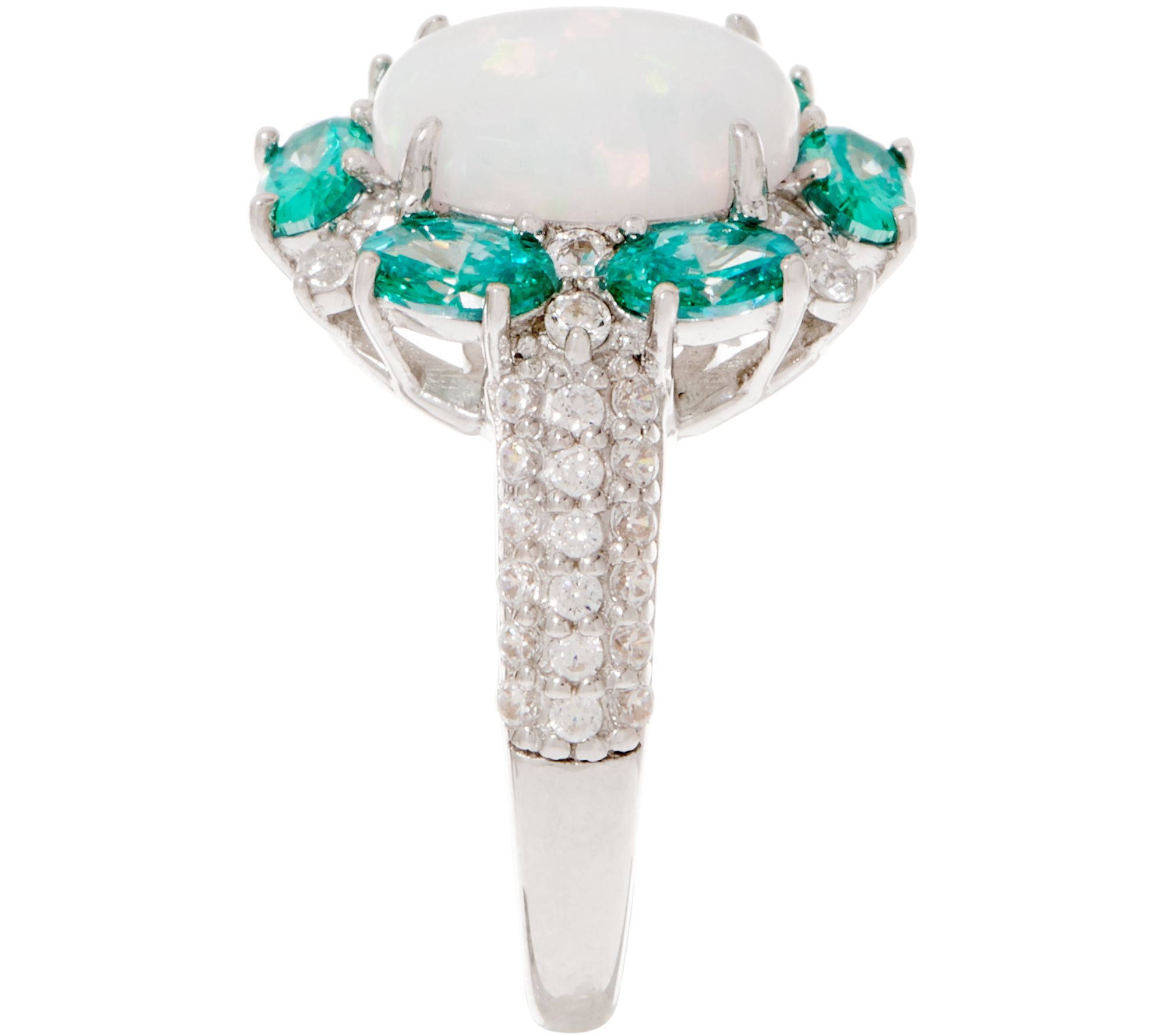 A gleaming synthetic opal sits atop a halo of cubic zirconia Diamonique simulated diamonds--alternating clear and green--to create this dignified statement ring.