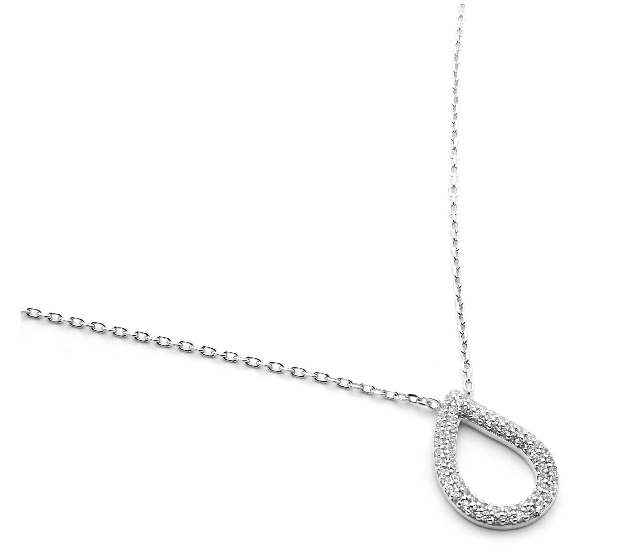 Graceful curves and sparkling details make this teardrop necklace an eye-catching finishing touch, whether paired with a crisp blouse for the office or a favorite dress for an evening out. Its round-cut simulated diamond cubic zirconia shimmers at the heart of a rhodium-plated sterling silver setting, easily adjustable for a custom fit.