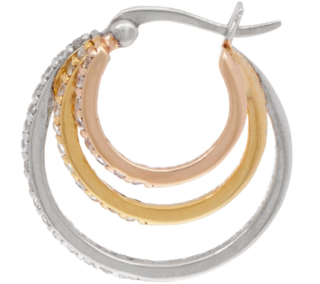 • Triple hoop design with small 14K rose gold-clad sterling silver hoop, medium 14K yellow gold-plated sterling silver hoop, and large sterling silver hoop; prong-set, round Diamonique simulated diamonds on front of hoops
