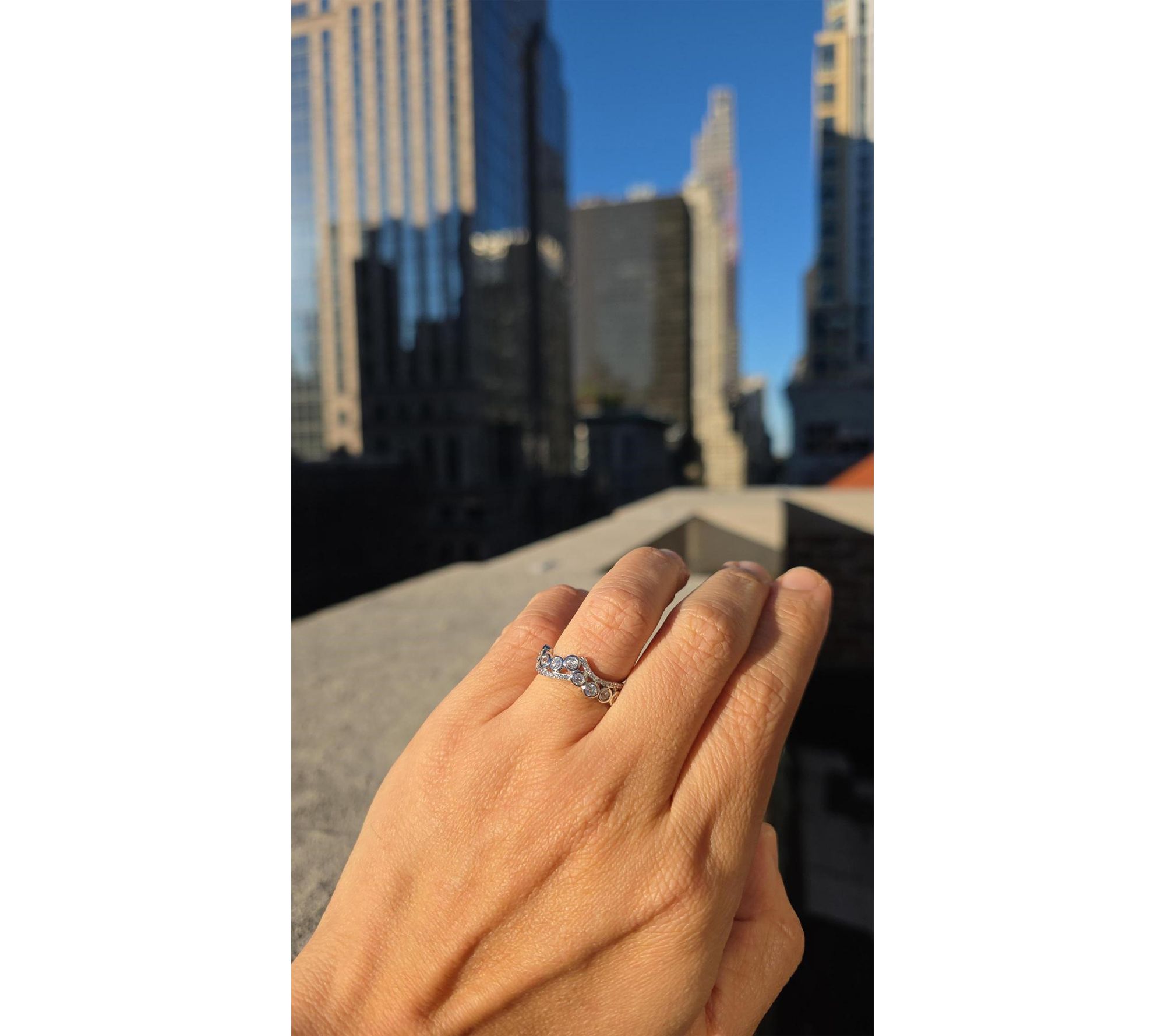 • Overlapping two-row chevron design; round stones in bezel and prong settings