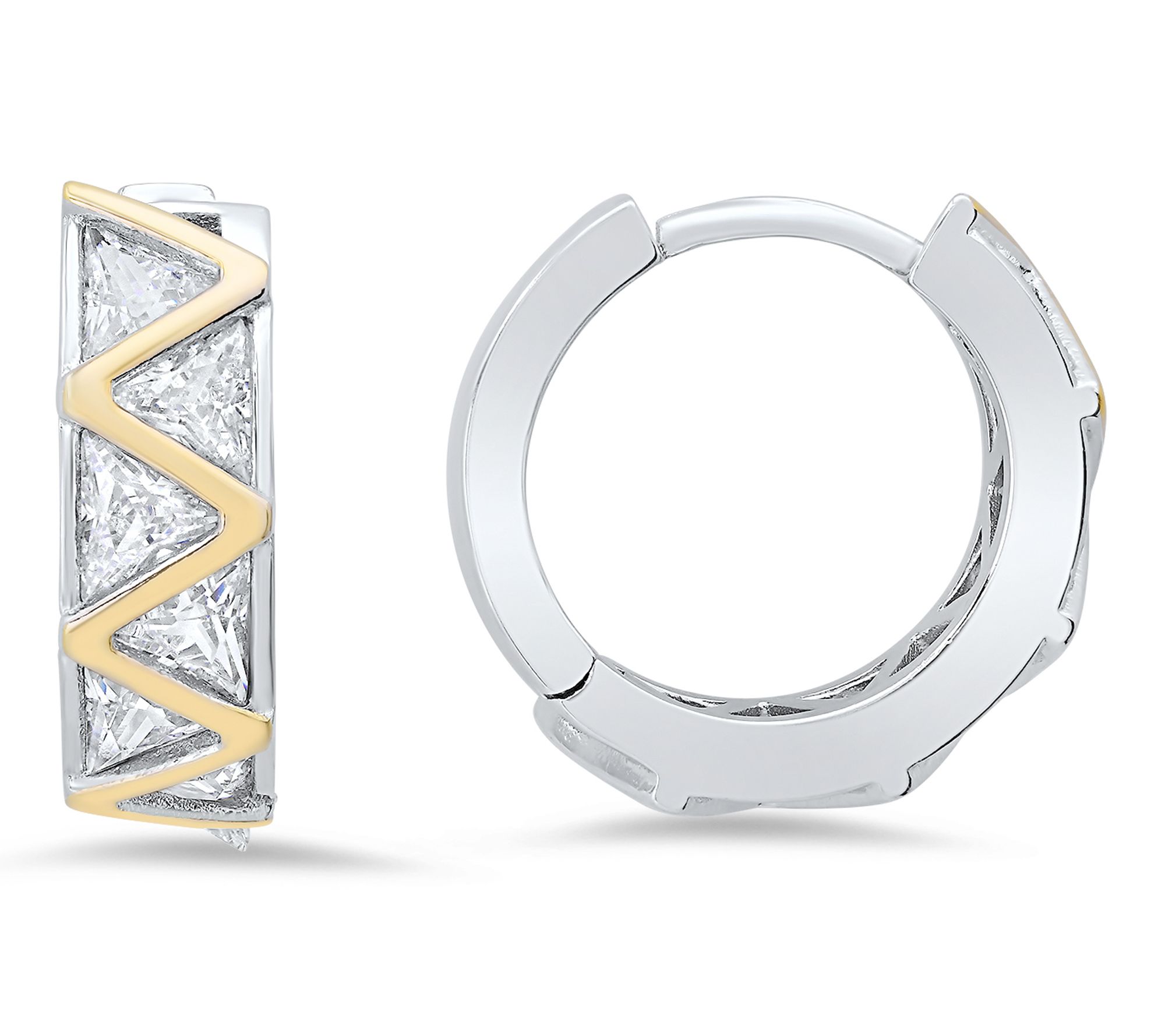• Zig zag hoop design; channel-set, trillion-cut Diamonique simulated diamonds; two-tone finish
