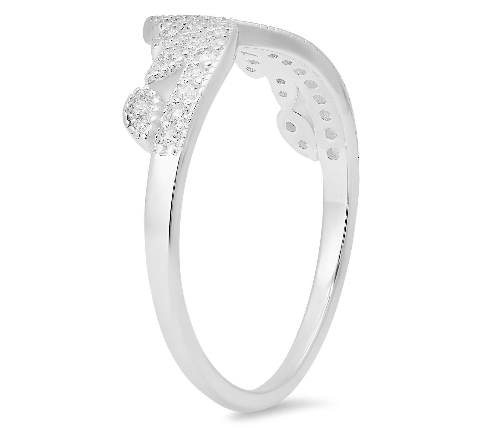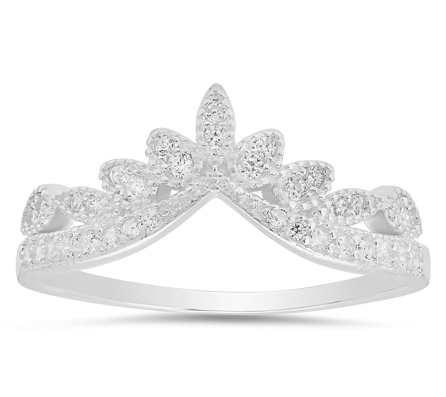 V-shaped with intricate floral detailing; prong-set, round-cut white Diamonique simulated diamonds; polished finish