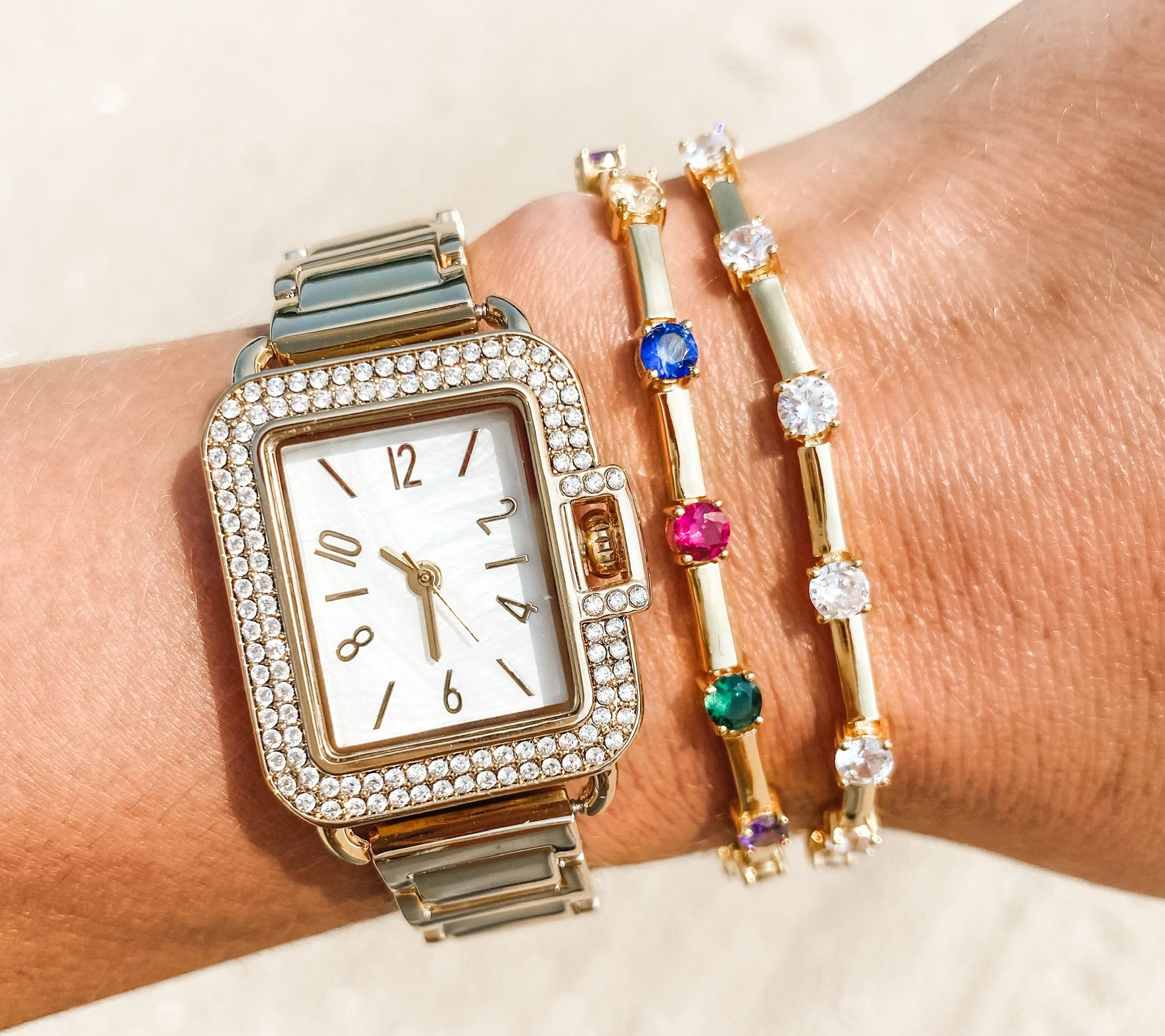 Rectangular stainless steel case; double row of Diamonique simulated diamonds on bezel; covered crown; stainless steel caseback; mineral crystal