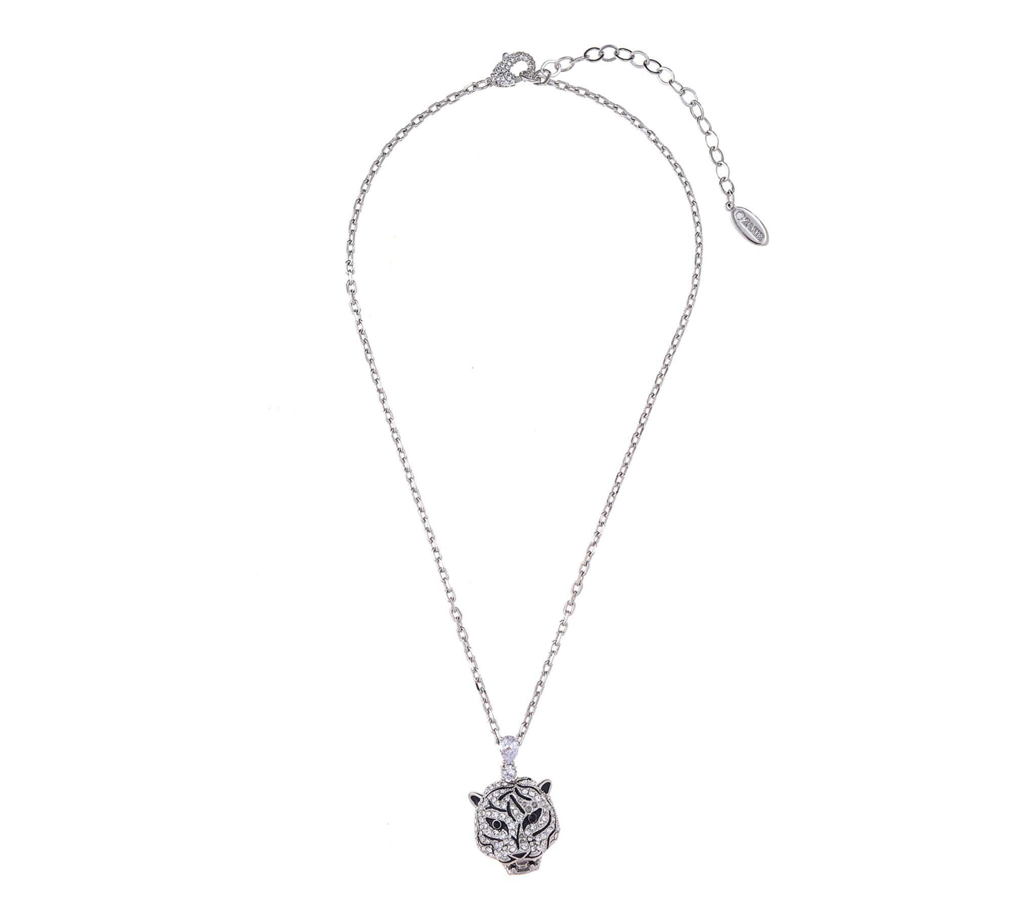 Conquer every day in fierce fashion with the Workday Warrior tiger pendant, dazzling with pave Diamonique simulated diamonds and bezel-set black Diamonique simulated diamond eyes. The diamond-cut oval link chain adds a touch of power-packed glamour to all your favorite looks. From Diamonique.