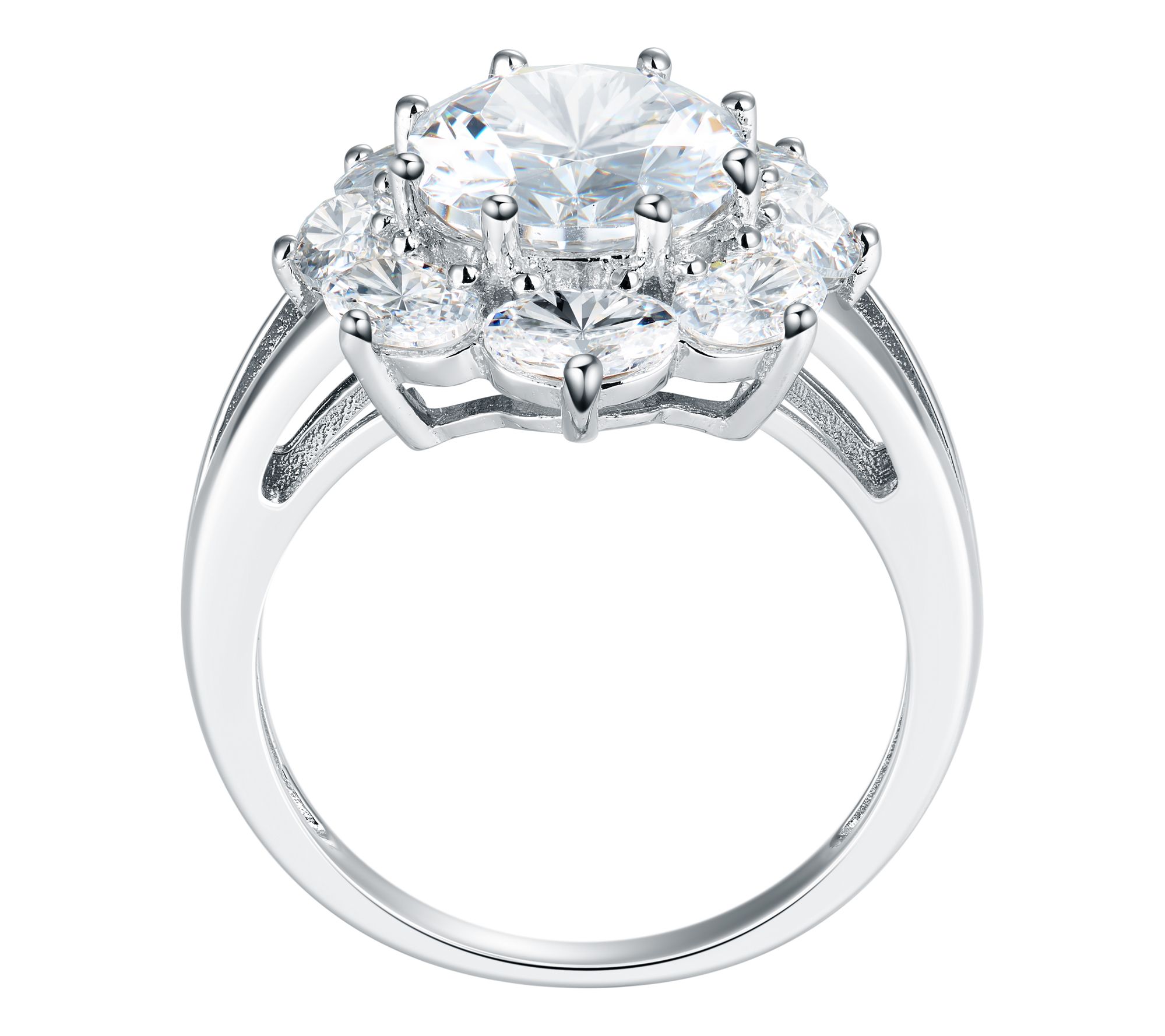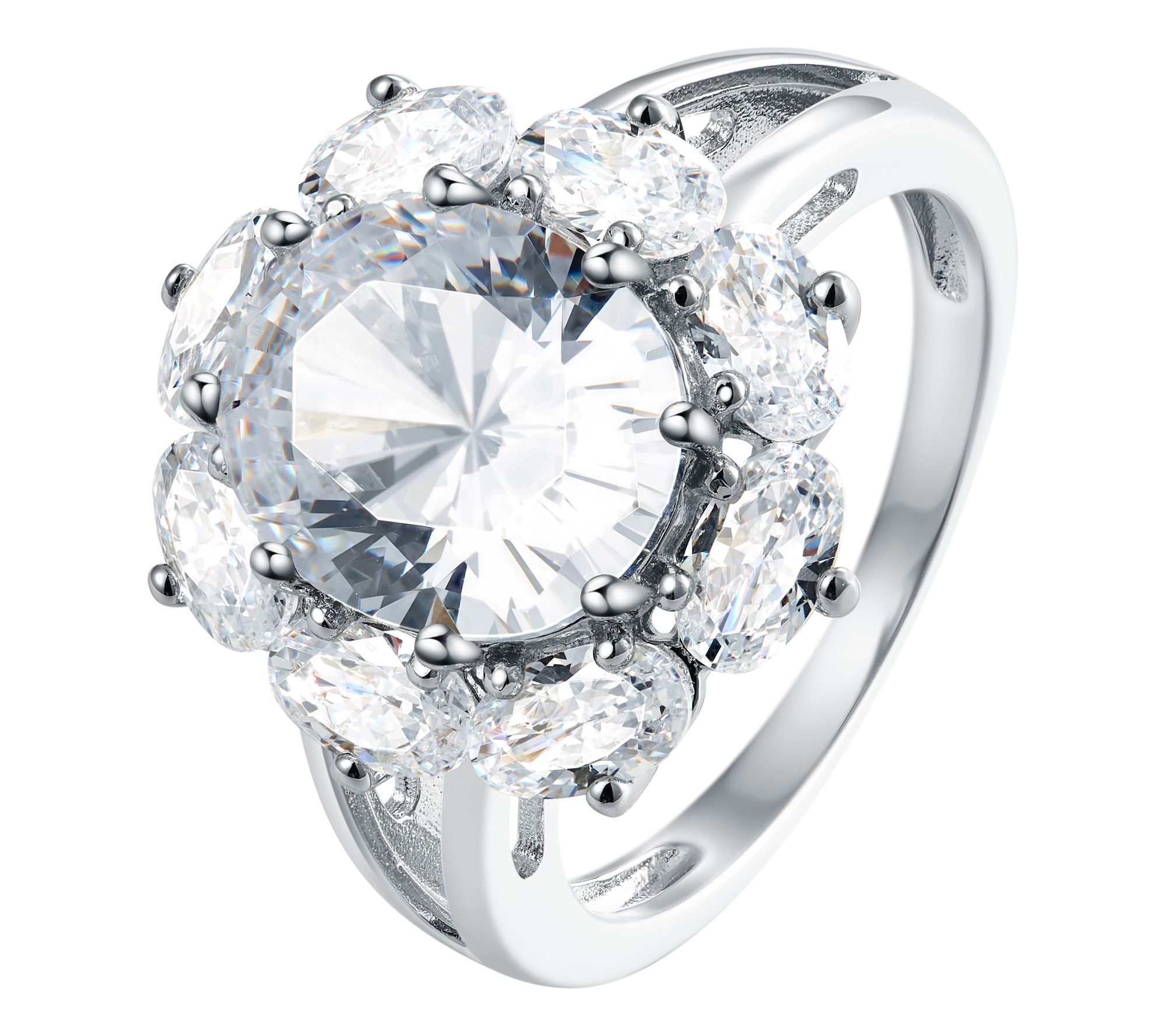 Oval-shaped, prong-set Diamonique simulated diamond center with a halo of oval-shaped Diamonique simulated diamonds