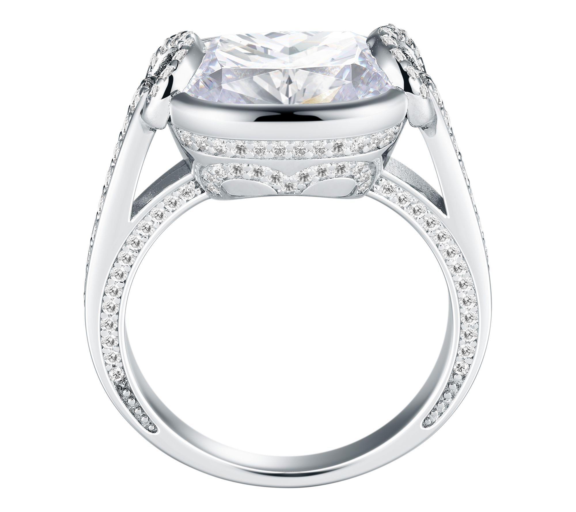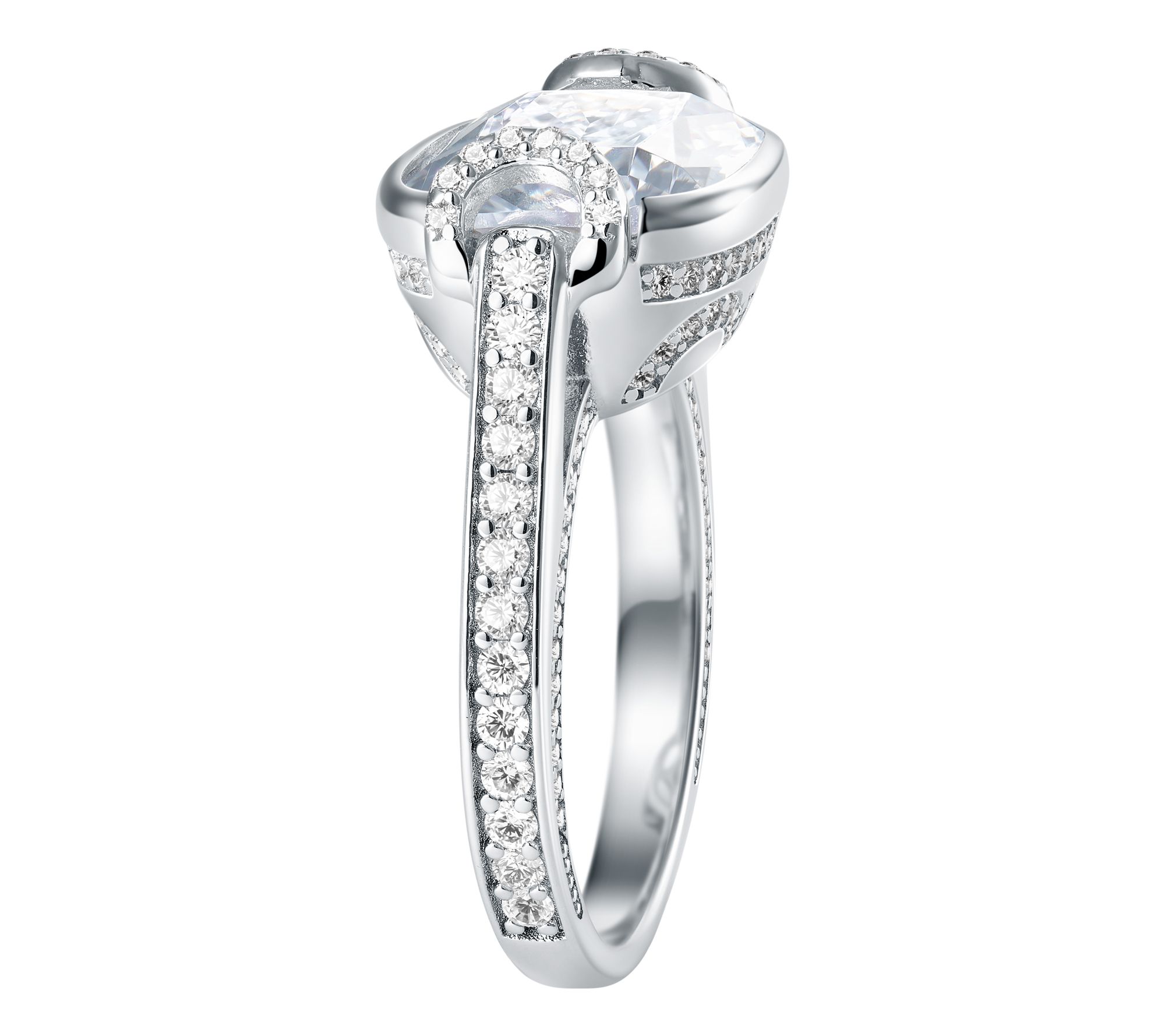 Center bezel-set, cushion-cut Diamonique simulated diamond framed by pave-set, round Diamonique simulated diamonds
