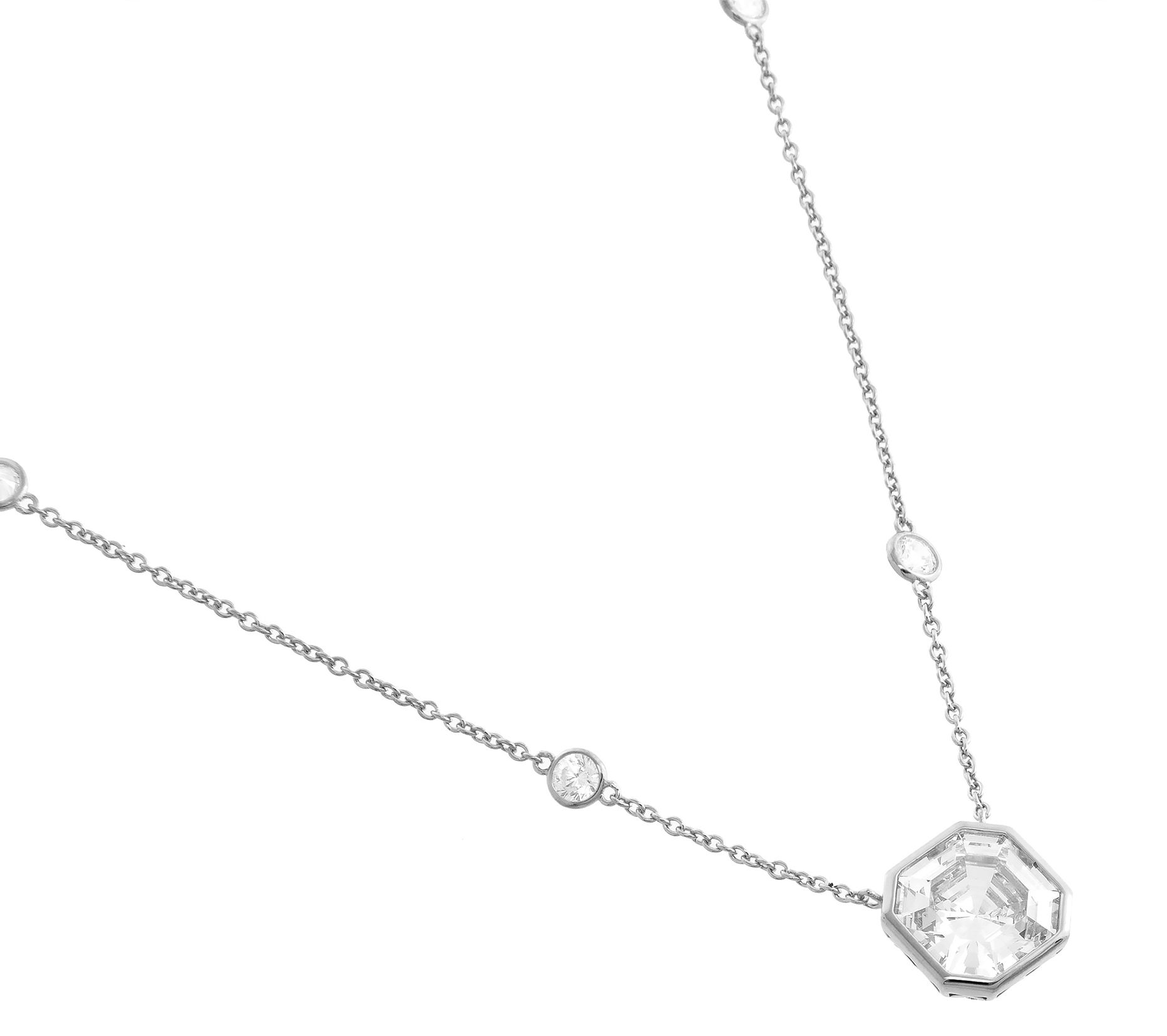• Asscher-cut, bezel-set simulated diamond center and round-cut, bezel-set simulated diamond stations; cable chain