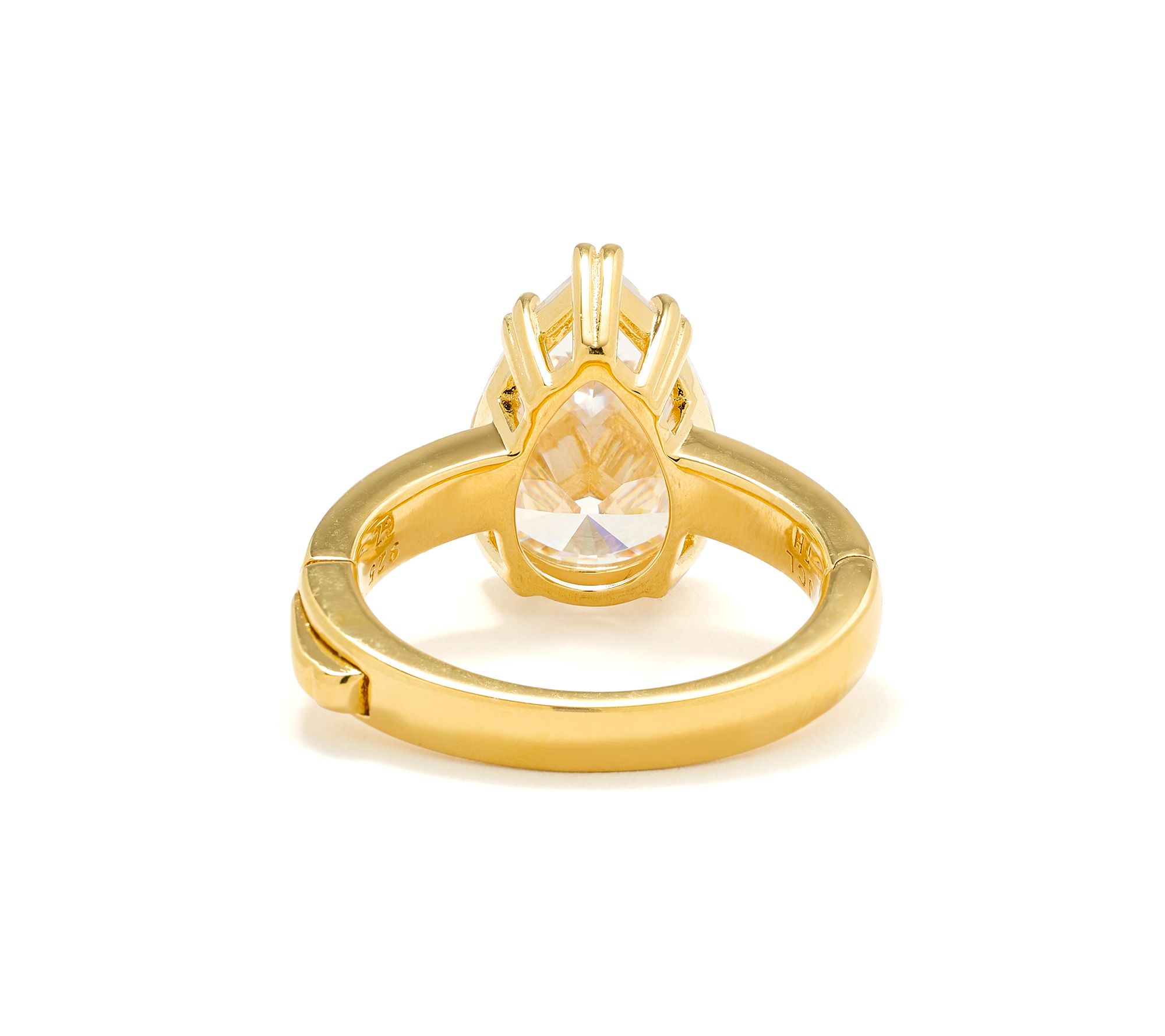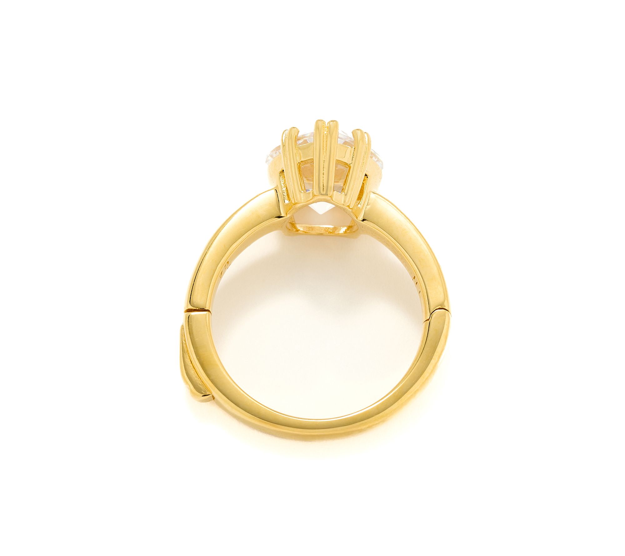 Styled for versatility, this accessible ring makes morning routines or evening events feel a little more glam with its effortless push-lock closure and bold sparkle. A prong-set Diamonique simulated diamond shines center stage in your choice of shape, while gleaming 14K yellow gold plated sterling silver and polished details offer eye-catching appeal.
