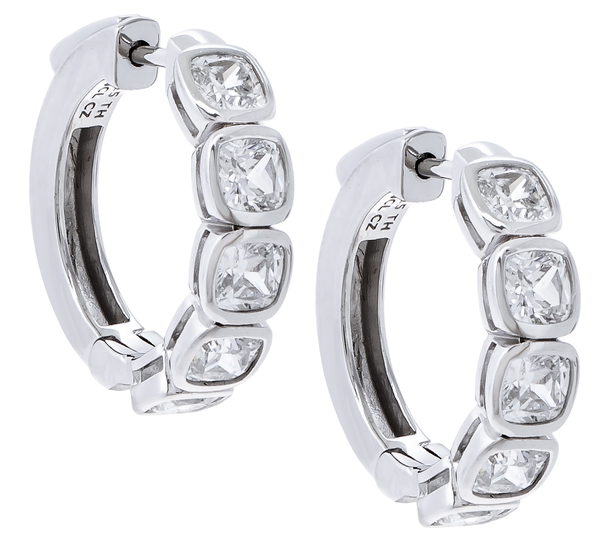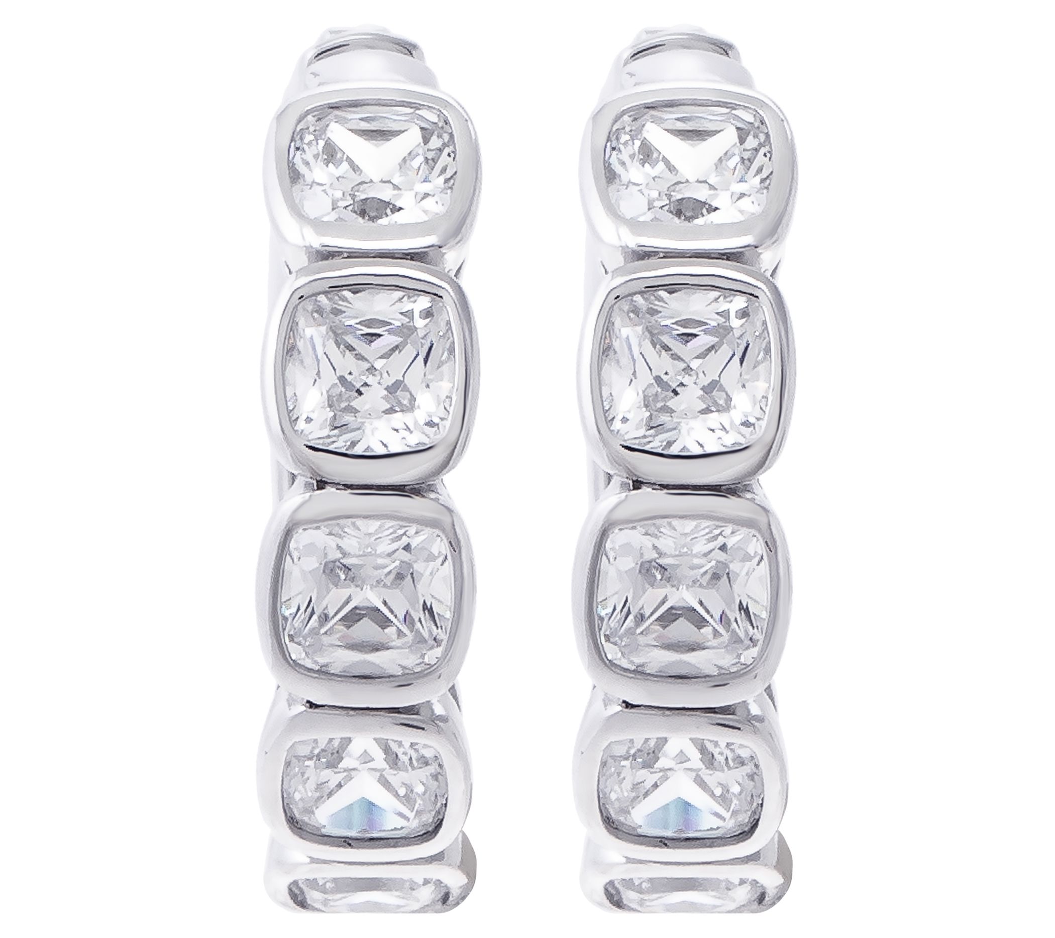 Add a touch of elegance to your look with the Diamonique x Jennifer Miller cushion hoop earrings. These stunning earrings feature cushion-cut Diamonique simulated diamonds in bezel settings, offering a timeless sparkle. Crafted from rhodium-plated sterling silver or 14K yellow gold-plated sterling silver, they are perfect for any occasion. From Diamonique.