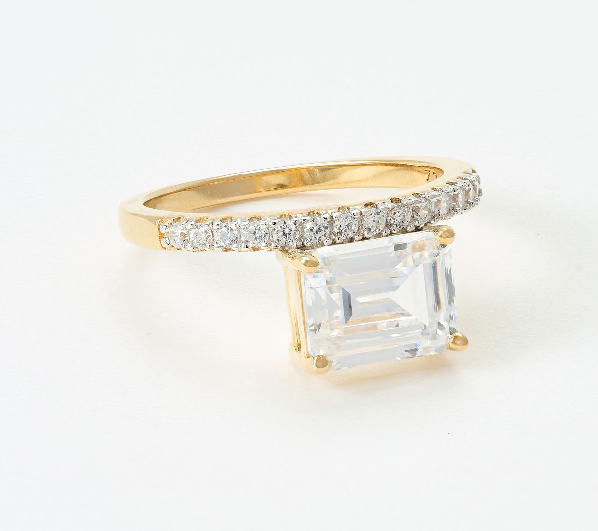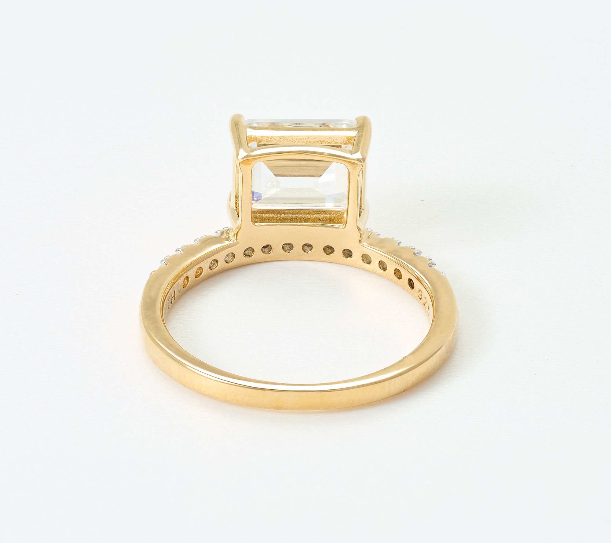 • Emerald-cut Diamonique simulated diamond in floating, prong-set style; prong-set round simulated diamonds on band; polished finish