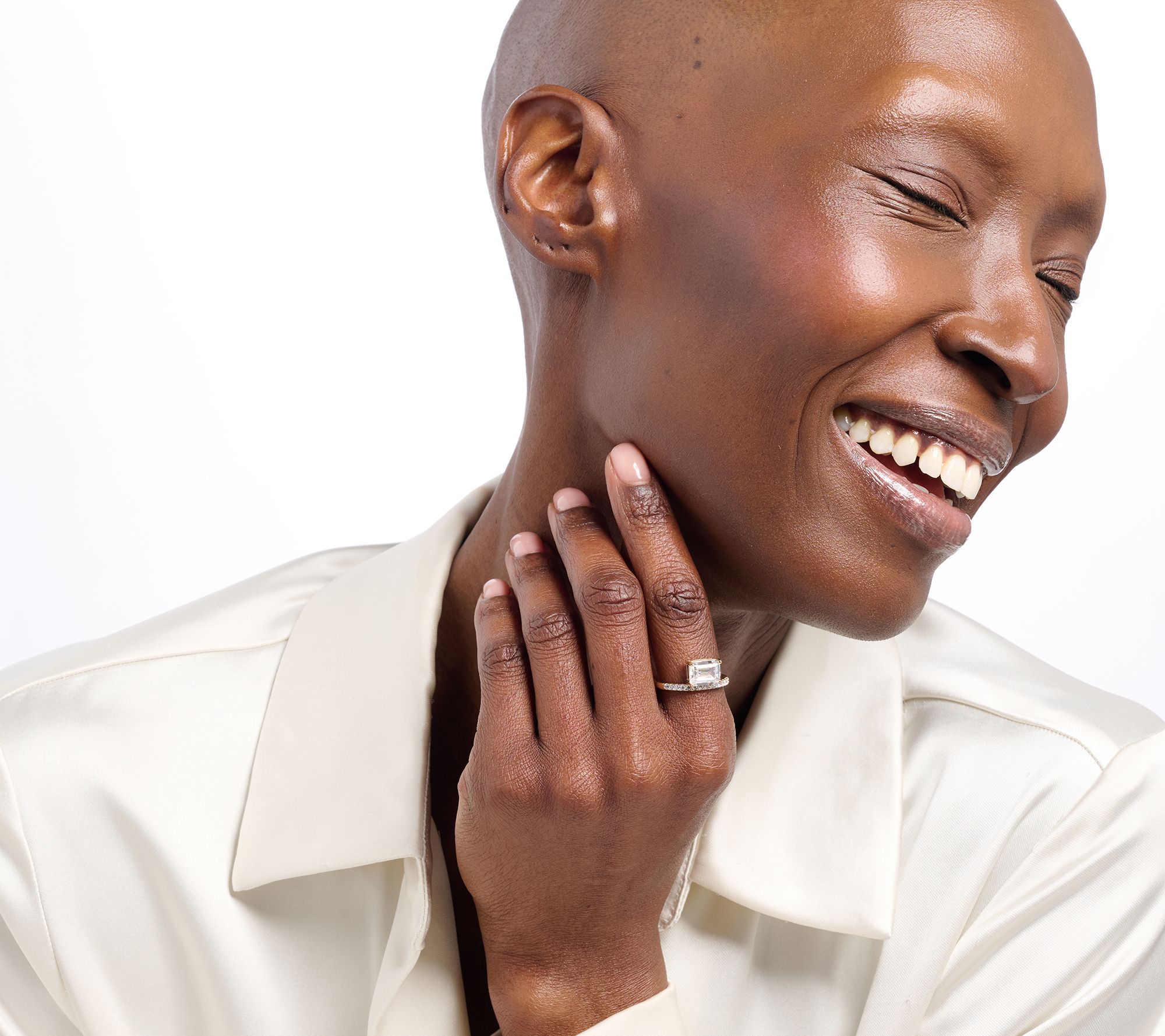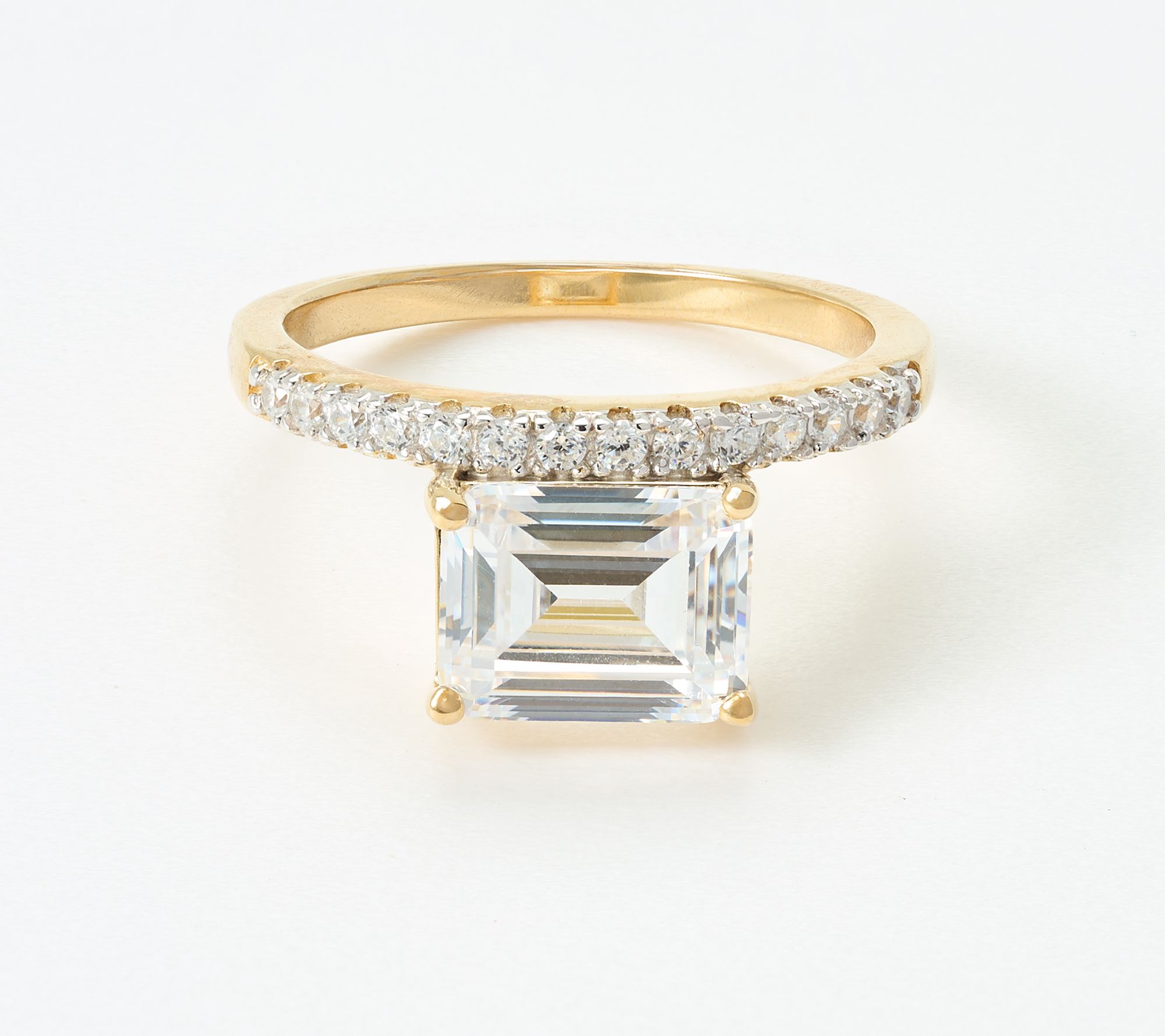 Add a touch of elegance to your everyday with this emerald-cut solitaire ring, featuring a floating prong-set Diamonique simulated diamond. Accents of round Diamonique simulated diamonds shine alongside the center, making it a stunning piece for dinner out or a sophisticated work meeting.
