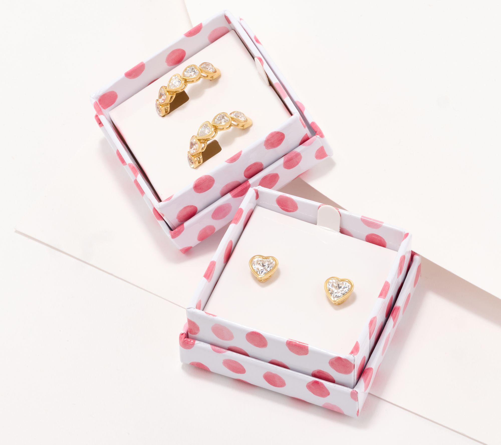 Two style staples pair up to bring you this brilliant jewelry collection completer. Whether you wear the huggie hoops or the heart-shaped studs, you'll be sporting the perfect amount of sparkle for any event or occasion. Give one pair to a friend and let them shine too!