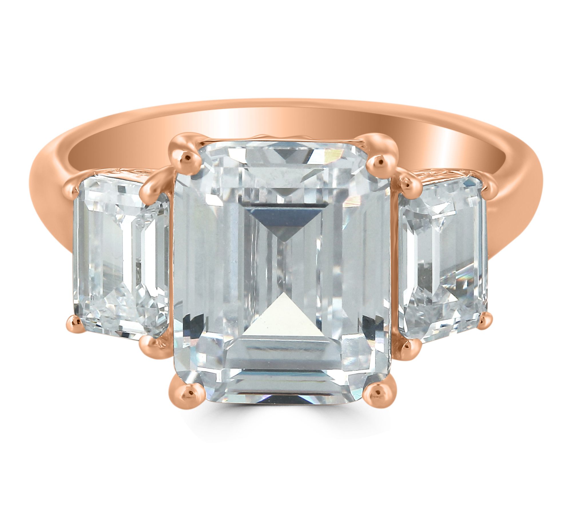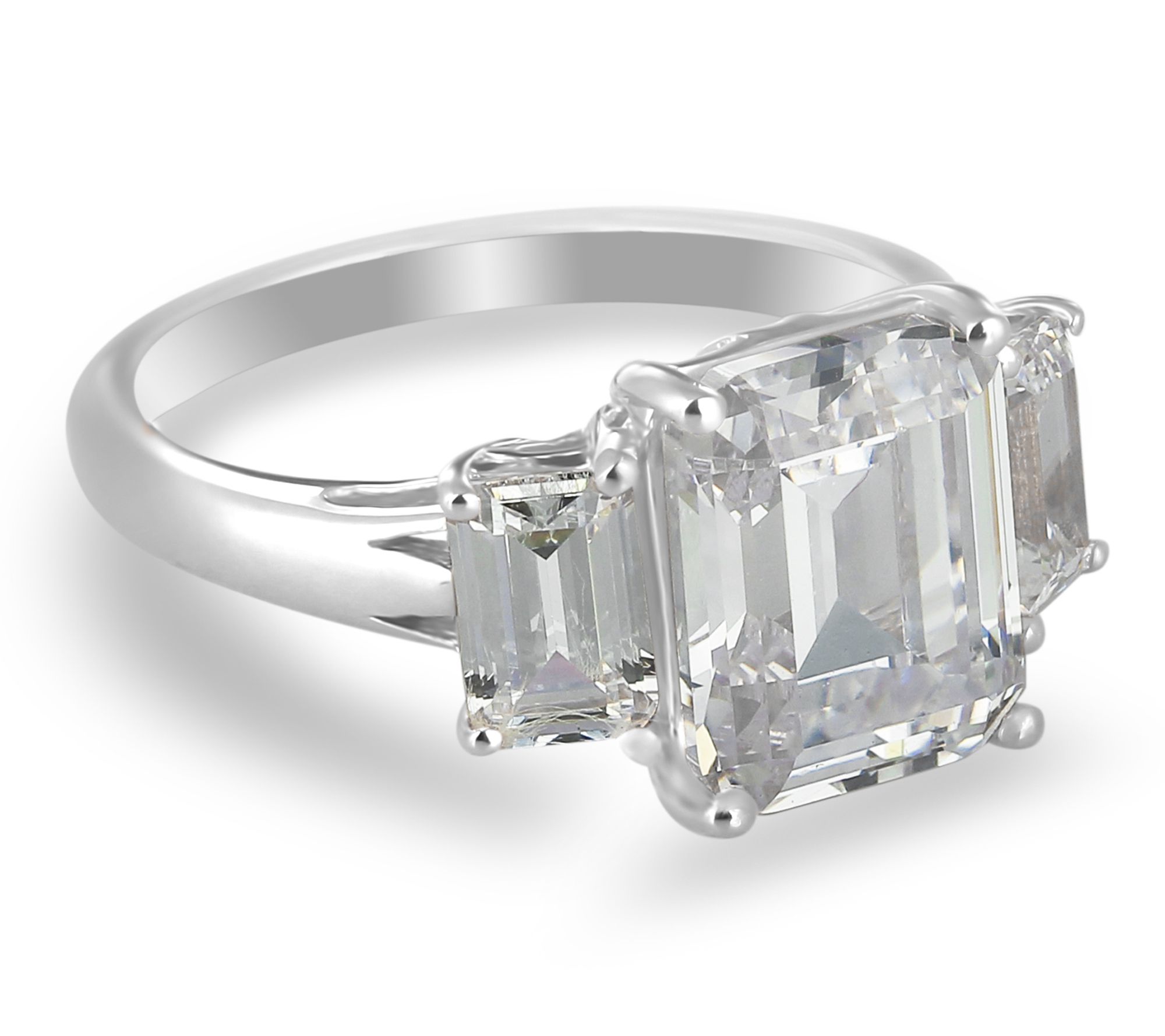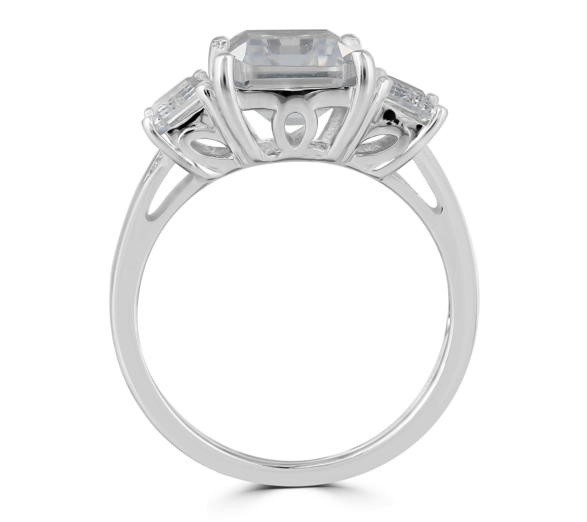 Emerald-cut, prong-set Diamonique simulated diamond in center; emerald-cut Diamonique simulated diamond on either side; polished band