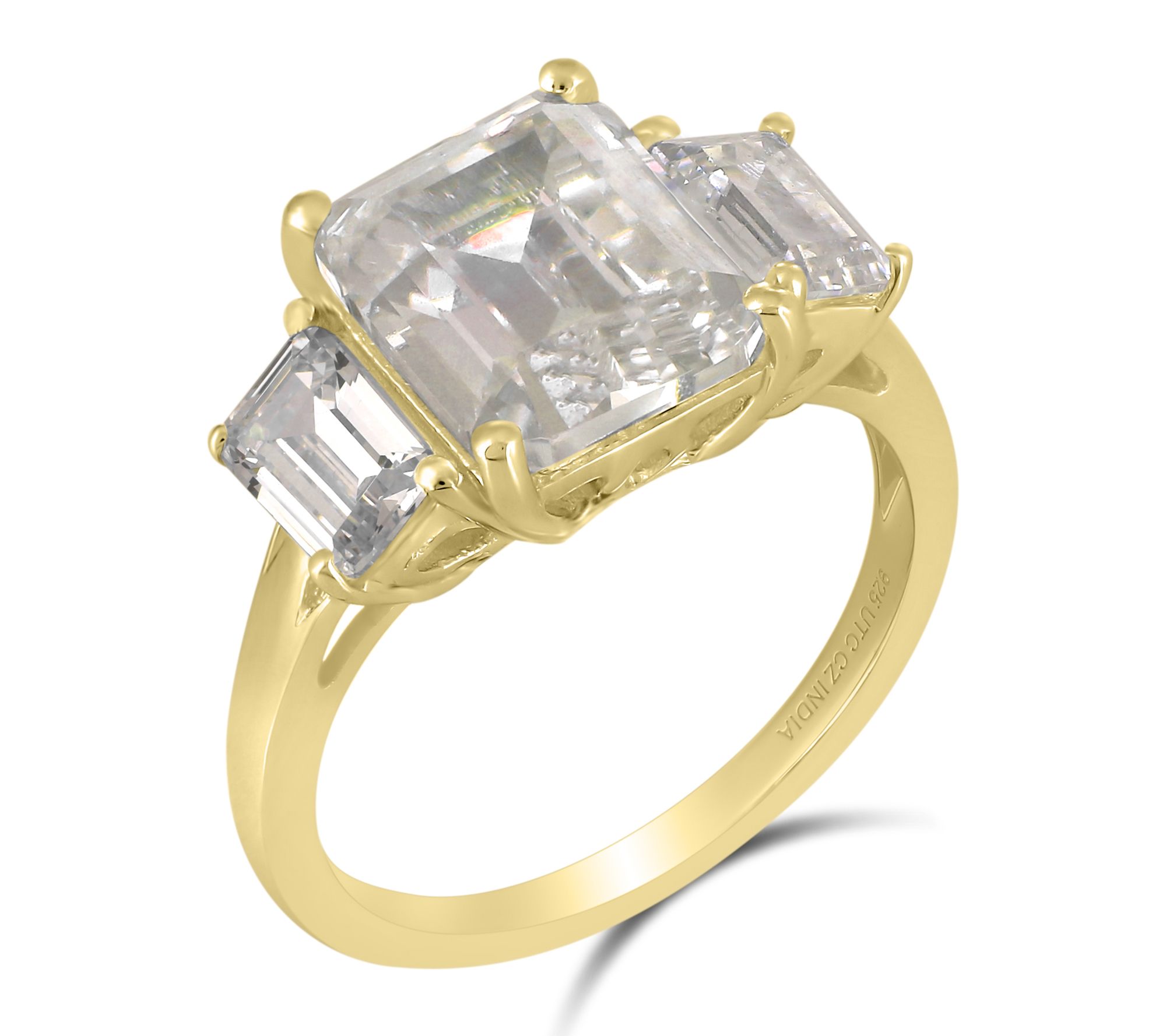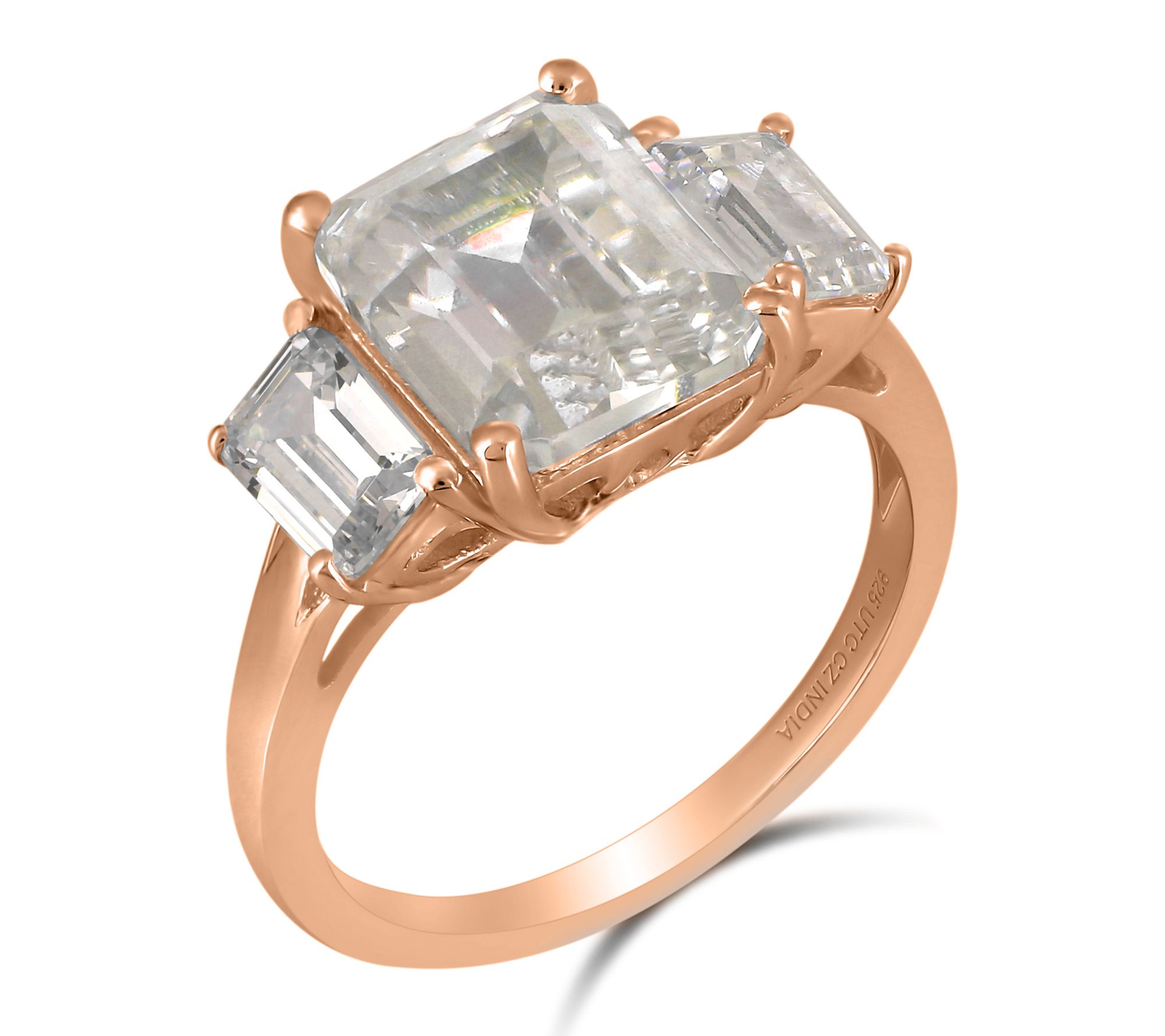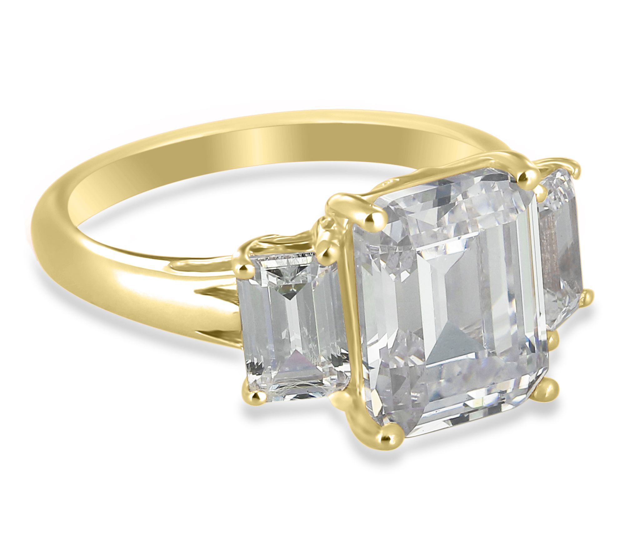 Emerald-cut, prong-set Diamonique simulated diamond in center; emerald-cut Diamonique simulated diamond on either side; polished band