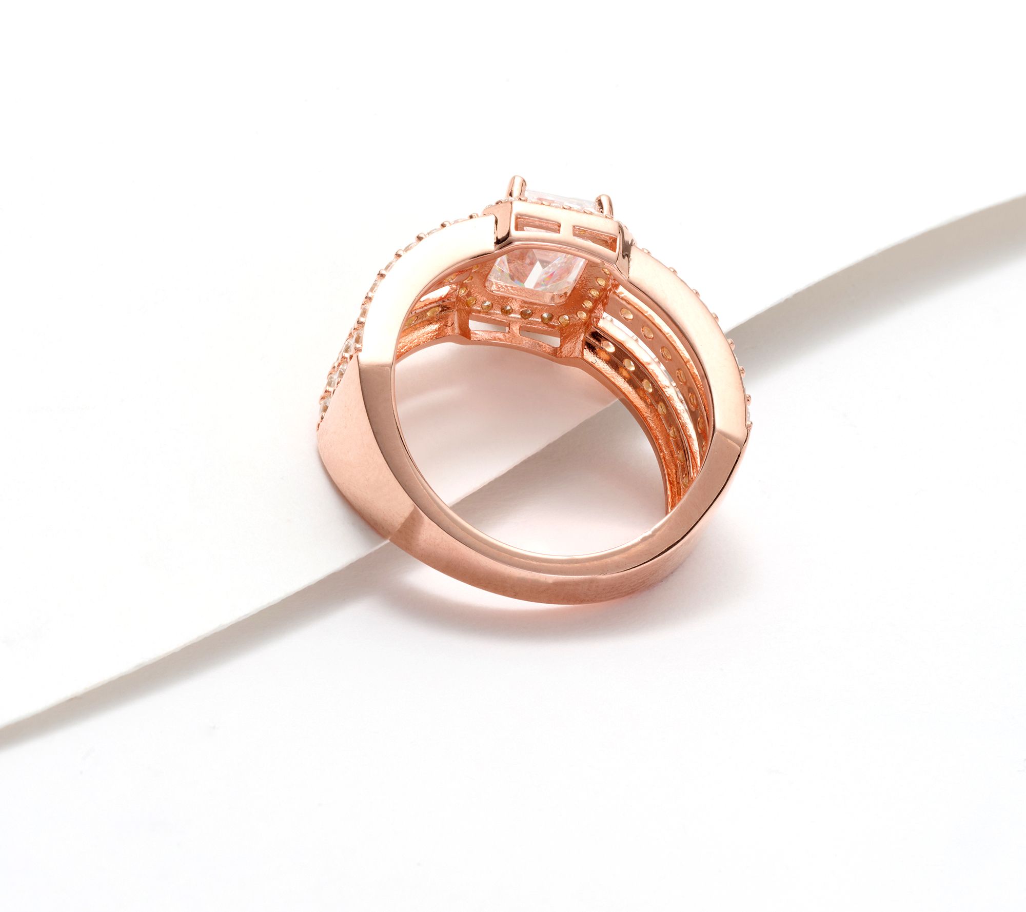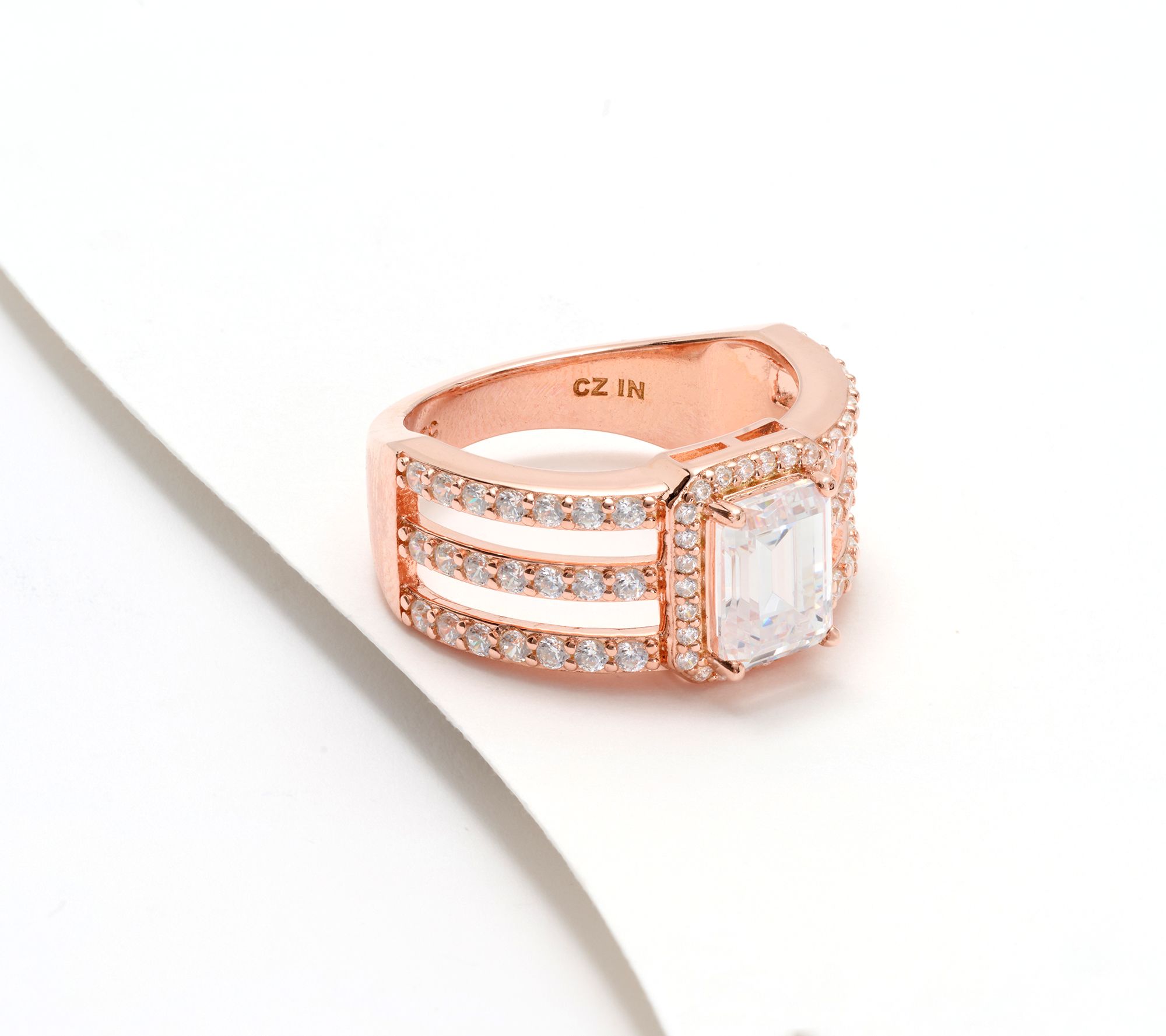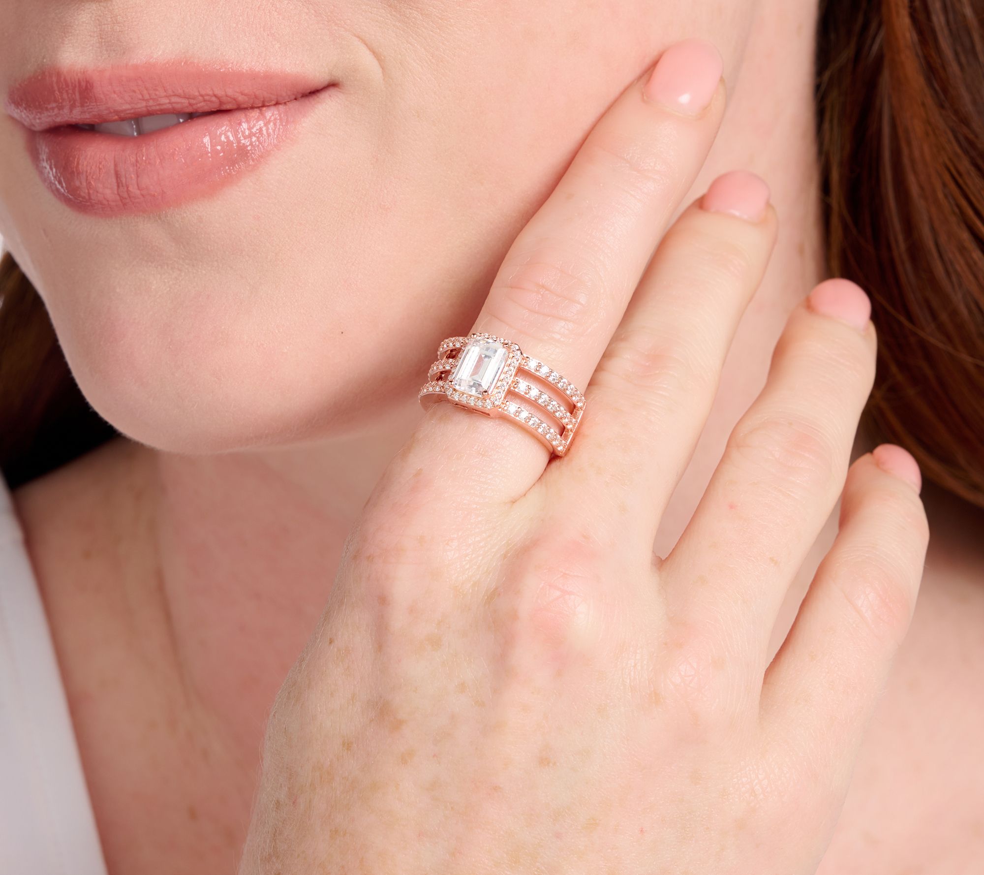 Whether you're attending a milestone event or adding something special to your everyday ensemble, this multi-band ring makes a striking statement. Its emerald-cut center stone is enhanced by shimmering pave accents and a graceful trio of bands, bringing shine and sophistication to any moment.